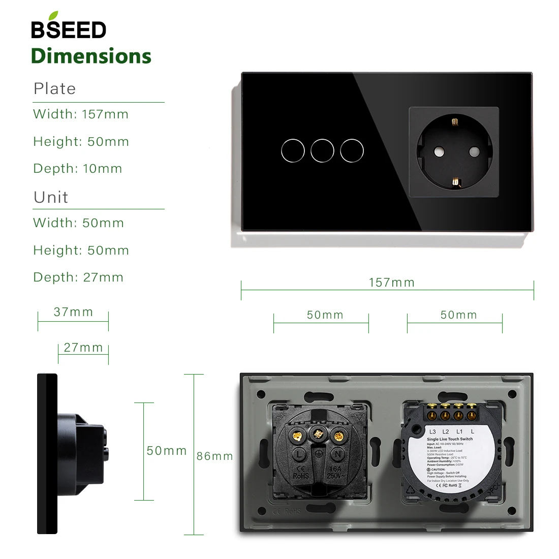 Сенсорный выключатель BSEED, настенная розетка европейского стандарта 1Gang, 2Gang, 3Gang, 3 цвета, прозрачная стеклянная панель 300 Вт, сенсорный выключатель 157 мм