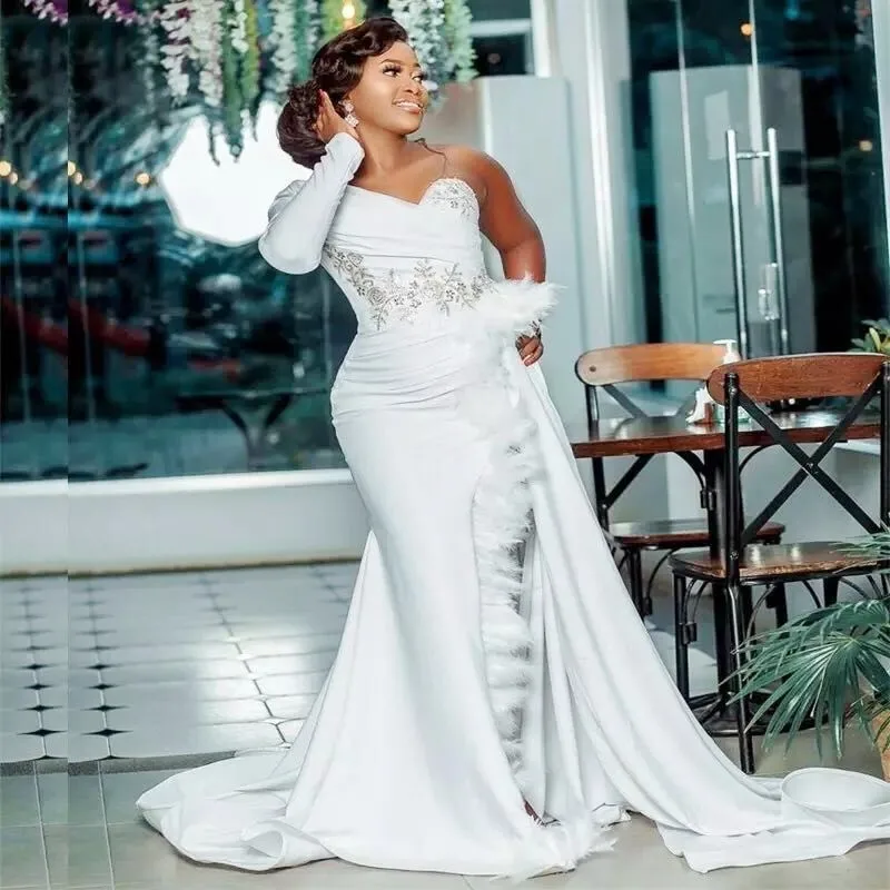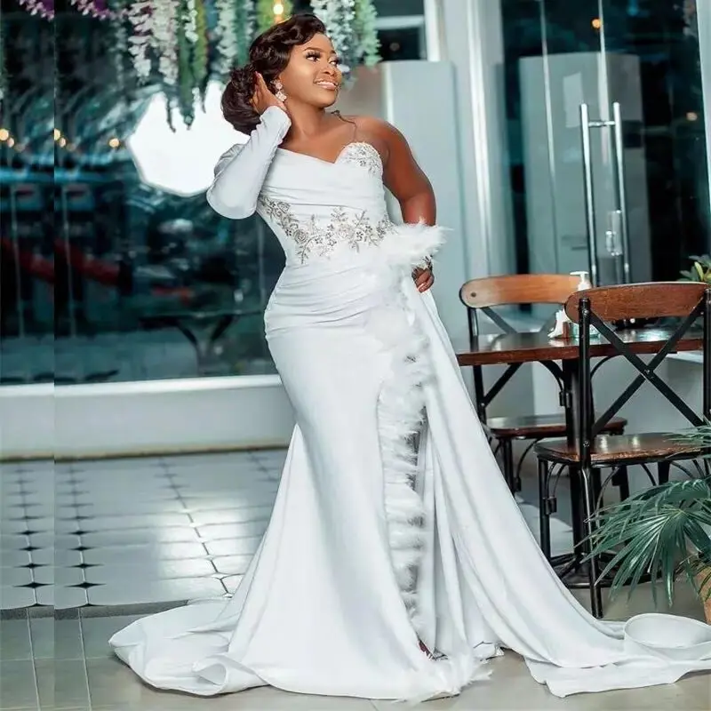 Африканский Свадебные платья Русалочки аппликация на одном плече перьев одежда с длинным рукавом свадебные платья мусульманская размера плюс платье vestido de noiva