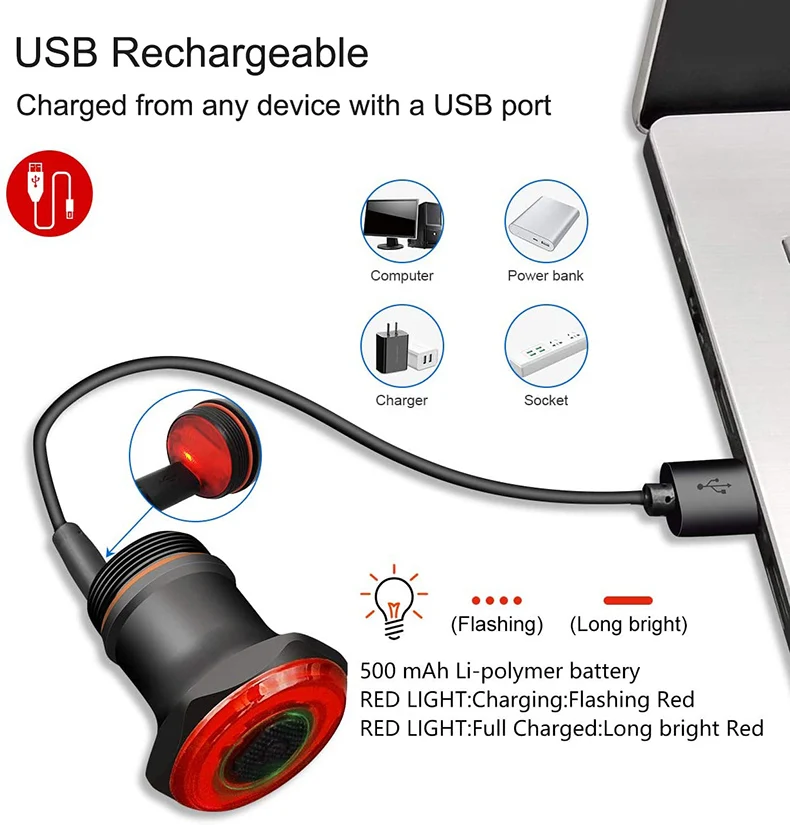 Перезаряжаемый USB: встроенный полимерный литиевый аккумулятор емкостью 500 мАч. Задний фонарь может быть легко заряжен любым устройством с usb-портом.Чувство тормоза: задний светильник автоматически переключается на режимы торможения, чтобы предупредить автомобиль, идущий сзади, при торможении или экстренном торможении, отлично подходит для езды ночью.Светильник чувство с автоматическим включением/выключением: супер яркий велосипед хвост светильник с розами 7 светильник ing (несколько режимов работы), чтобы сохранить вашу безопасность езды. Встроенный с датчиком движения-автоматически выключается, когда нет движения через 3 минуты и начинается снова, когда есть какое-либо движение.Широкий обзор: ЧПУ полностью алюминиевый сплав с COB светодиодный встраиваемые супер яркий велосипед хвост светильник, 500 мА/ч, литий-ионный аккумулятор обеспечивает невероятно широкий с девятью поворотными красный светильник, 180 градусов видимости, видимость до 600 футов.IPX6 Водонепроницаемый: IPX6 Водонепроницаемый и пыленепроницаемый, спрей для воды в любом направлении не попадет в светильник даже при сильном дожде. Будьте в безопасности в дневное и ночное время езды.Простая установка: Этот перезаряжаемый велосипедный Светильник обеспечивает Регулируемый силиконовый ремешок, делает задний велосипедный светильник гибким для быстрой установки или снятия напряжения. Велосипед хвост светильник может быть легко установлен в считанные секунды без инструментов, для всех типов велосипедов, дорожный мотоцикл, горный велосипед MTB, гибридный. Задний велосипедный светильник очень удобно отвинчивать от крепежной крышки для подзарядки.
