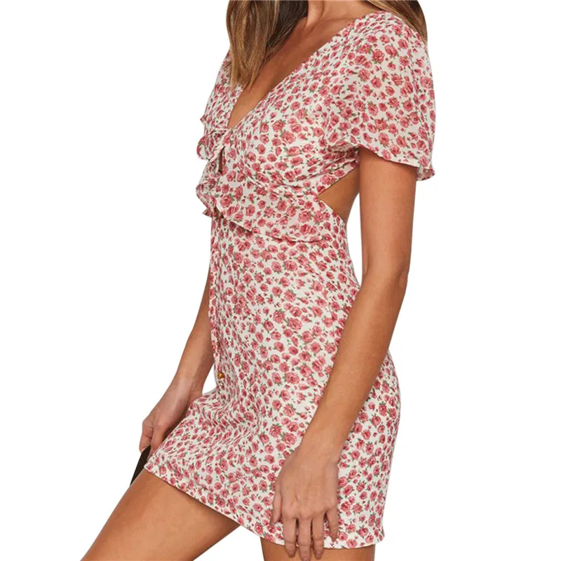 Imcute Винтаж Цветочный принт Сексуальное Женское Платье 2021 пляжная одежда короткий рукав кружевное платье с v-образным вырезом на шнуровке праздничная одежда Открытое платье с открытой спиной