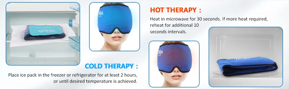 Горячая холодная терапия-Обертка со льдом для головы обеспечивает адресную горячую или холодную терапию для головы или глаз. Замораживайте пакет геля в морозильной камере не менее 2 часов для холодного сжатия. Для горячей терапии: Поместите головную пленку в микроволновую печь в течение 10-15 секунд для горячей терапии.