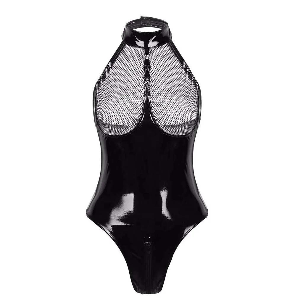 Эротическое нижнее белье, привлекательный латексный костюм кошки с вырезами, ажурная одежда, комбинезон с открытой промежностью, комбинезон из лакированной кожи, облегающий боди для груди