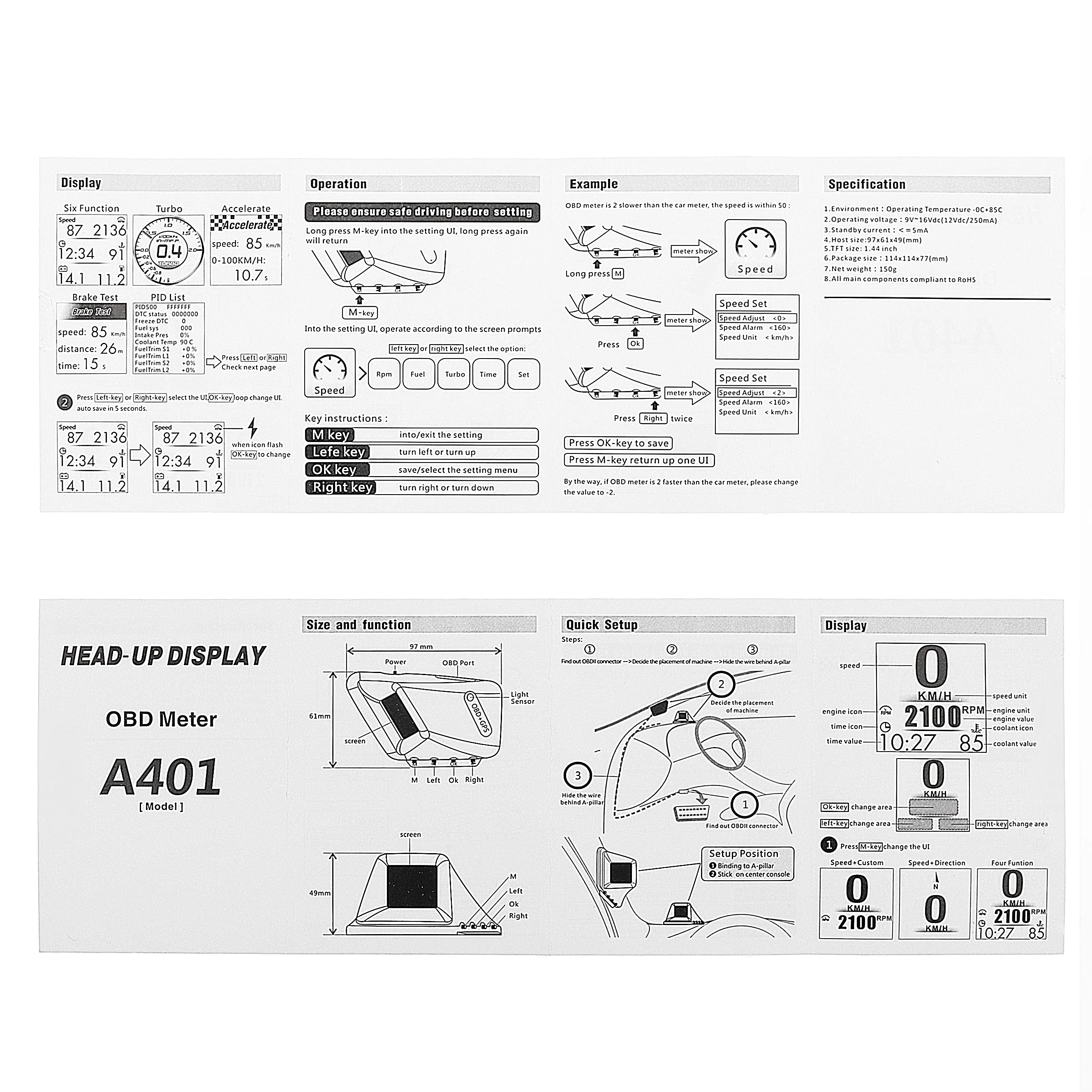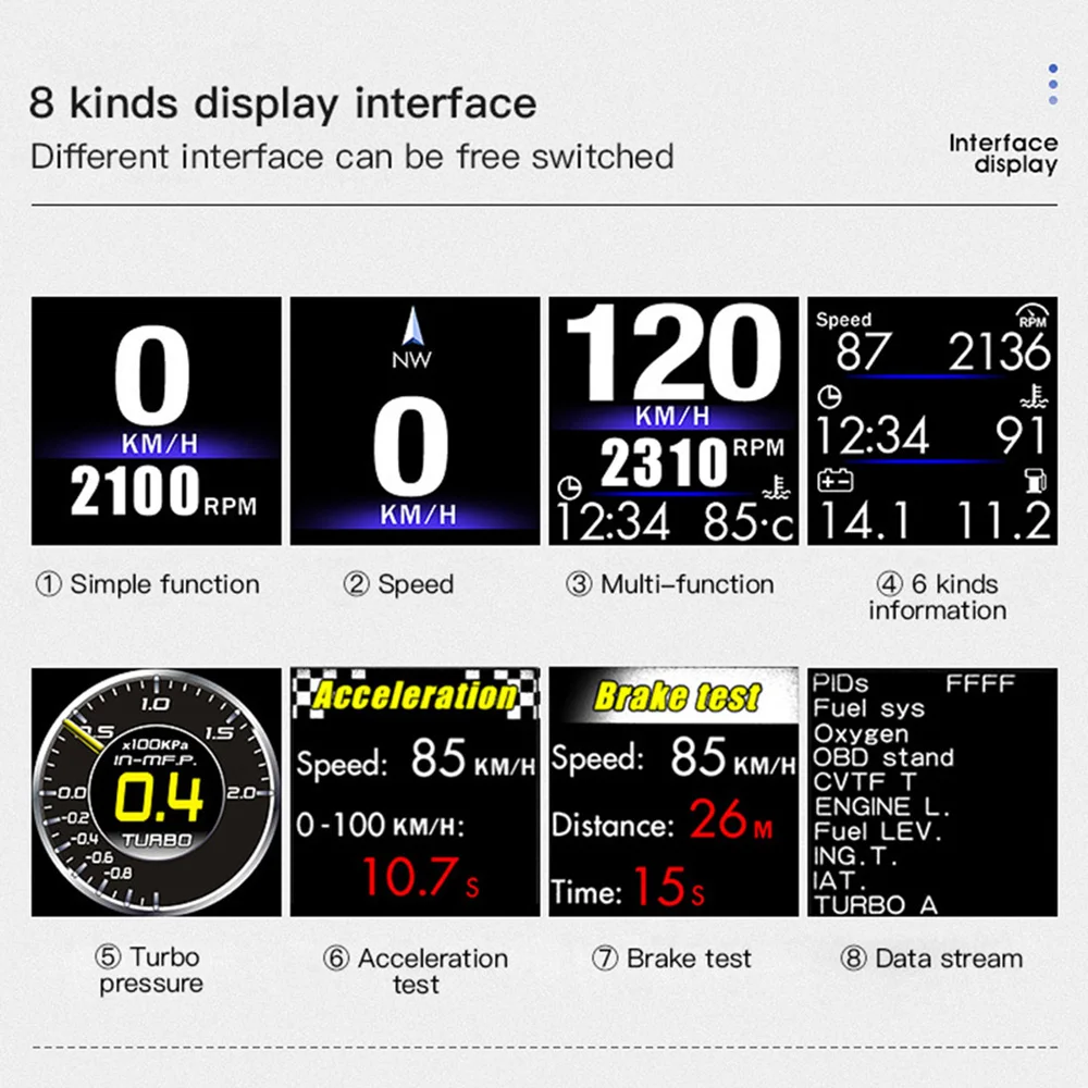 Материал: АБС-пластикЦвет: черныйСистема: OBD + GPSРазмер экрана: 2 дюйма LCDРазрешение экрана: 240*240Чистый металл Размер: около 9,7*6,1*4,9 см/3,82*2,40*1,93 дюймовВес голого металла: около 40 гДлина линии: 175 см