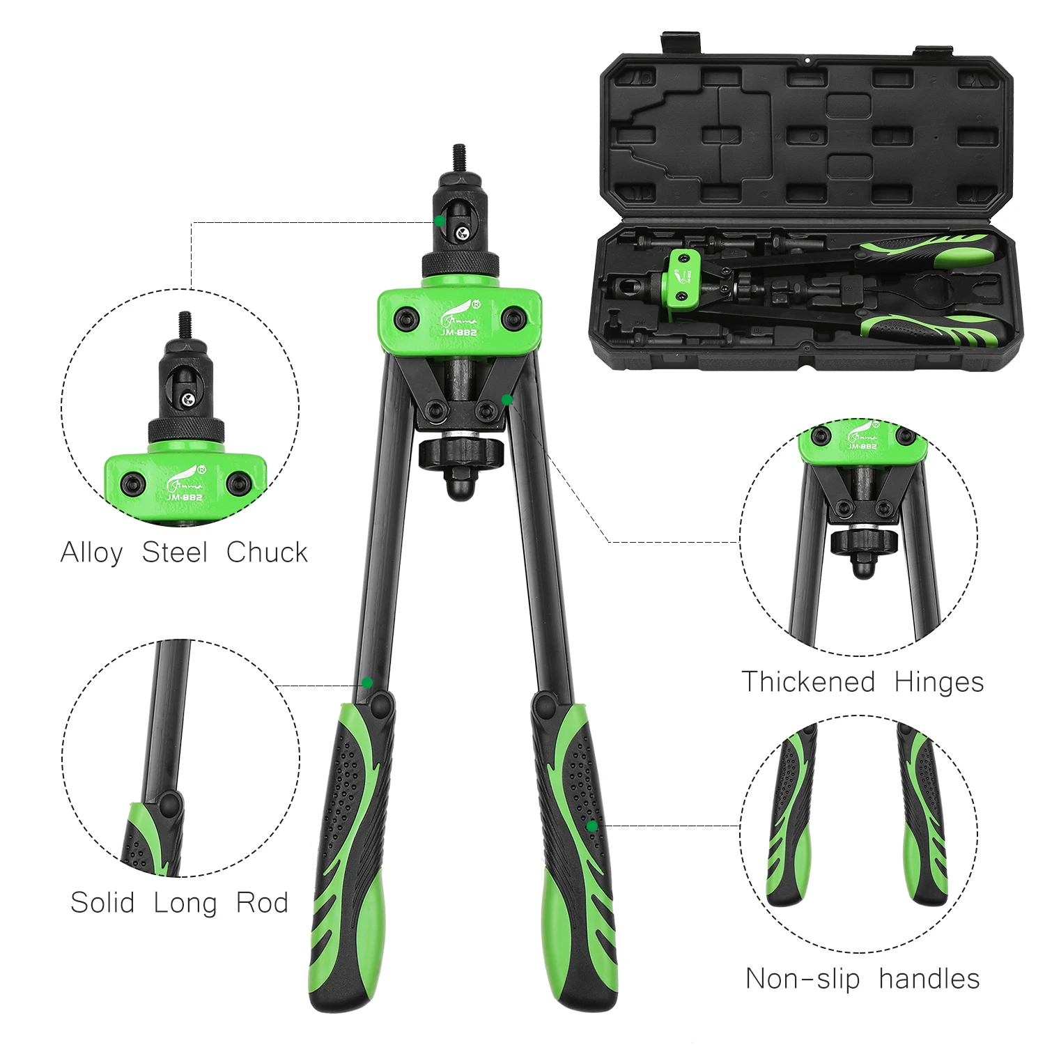 Особенности:Без усилий: более длинная ручка с утолщенными петлями обеспечивает максимальное давление для быстрого и легкого сжатия и клепки.Метрические оправы: поставляется с 6 взаимозаменяемыми оправами/комплектами метрических M3/M4/M5/M6/M8/M10.Нескользящая ручка: эргономичная ручка покрыта нескользящим мягким пластиком, чтобы обеспечить надежное сцепление.Хорошо продуманные: высококачественные аксессуары с черным покрытием отличаются хорошей устойчивостью к влажности и устойчивостью к ржавчине.Легко хранить: поставляется с формованной переноски Чехол с каждое изделие с маркировкой держит инструменты и легко транспортировать.Примечание:* Гайки с заклепками в комплект не входят.Рекомендуемый размер отверстия для каждой заклепки гайки-M6 (используется отверстие 11/32 ")-M8 (используется отверстие 7/16 ")-M10 (используется отверстие 1/2 дюйма)Характеристики:Материал: легированная стальЦвет: зеленый и черныйГоловка Длина: 4,5 см/1.77inДлина ручки: 30 смВес изделия: 891 г/31,42 унцийВес посылка: 1820 г/64,19 унцийПосылка Размеры: 38,5*15,5*6,5 см/15,15*6,1 * 2.55inУпаковочный лист:1 * Ручной клепальный набор1 * Руководство пользователя (на английском языке)