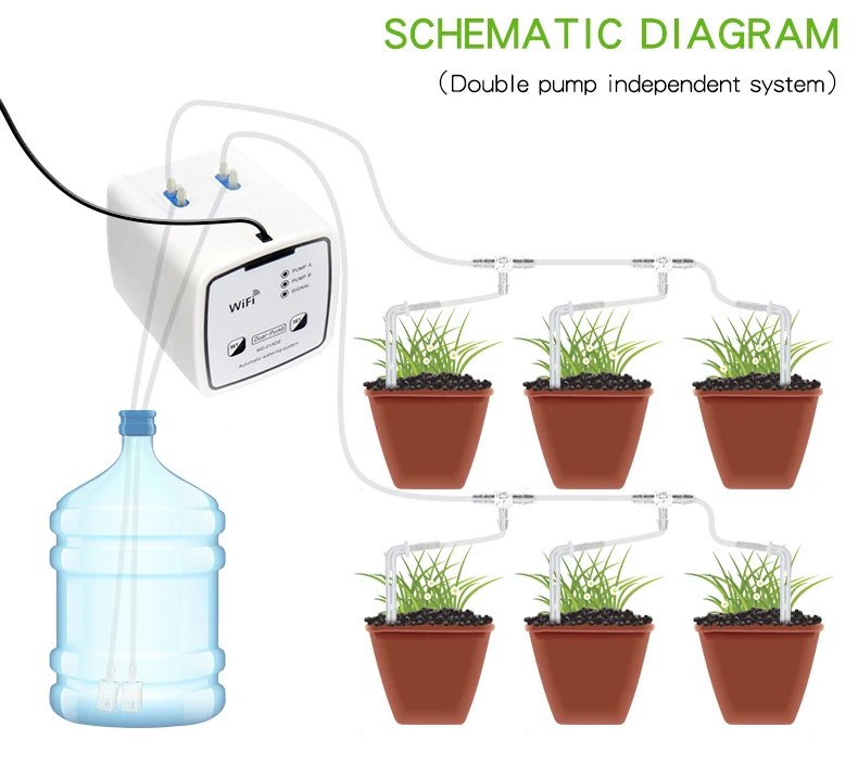 Материал пластика:>ABS + PP Используется модель батареи: 4-AA 1,5 V Демпфирующий материал корпуса насоса: силикагель Рабочая температура: 0-50 ℃ Адаптер: DC 5V 2A DC002 3,5/1,3 (длина линии 1,2 метров) (штепсельная Вилка европейского стандарта, штепсельная вилка стандарта США, штепсельная вилка стандарта Великобритании) Максимальное давление воды: ≥ 30 Пай (200 кПа) Расход: 0,3-0.8LPM Шум: ≥ 65 дБ (расстояние 30 см) Головка: ≥ 2,5 м Диапазон всасывания: ≥ 2 м Wi-Fi: 2,4 ГГц Приложение: eWeLink Список товаров WIFI двойной насос 20 бассейнов: 1 WIFI двойной хост насоса, 15 М шланг, 20 тройников, 20 капельных стрел, 2 фильтра, 1 адаптер (длина линии 1,2 м), 1 USB кабель, 1 отвертка, Инструкция на английском языке