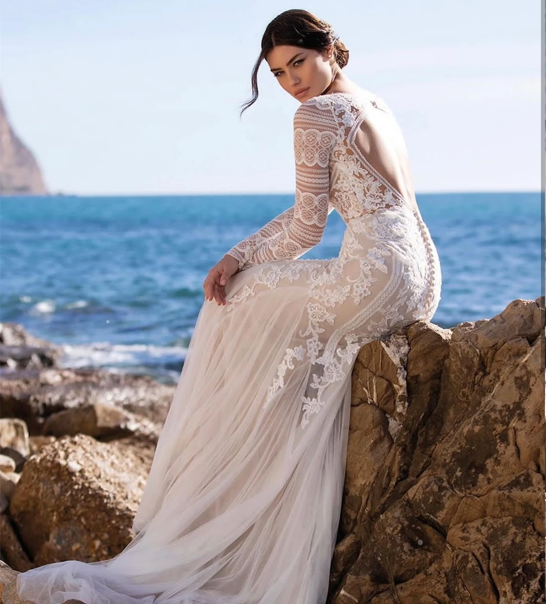 Женское кружевное платье с юбкой-годе, длинным рукавом и V-образным вырезом