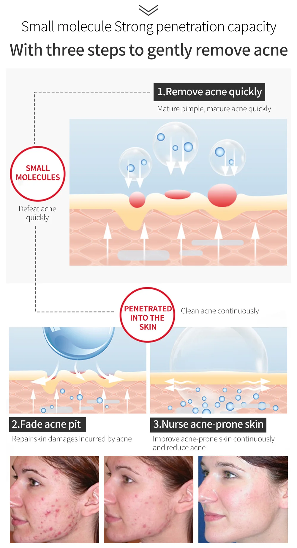 Небольшая молекула, сильная способность проникновенияС тремя шагами, чтобы аккуратно удалить акне1. Быстро удаляет акнеЗрелых прыщей, зрелых акне быстроНебольшие молекулыБыстро победите акнеПроникает в кожуБеспрерывная очистка от акне2. Выцветание акне ямыВосстанавливает повреждения кожи, вызванные акне3. Уход за кожей, подверженной акнеПостоянно улучшает кожу, подверженную акне, и уменьшает акне