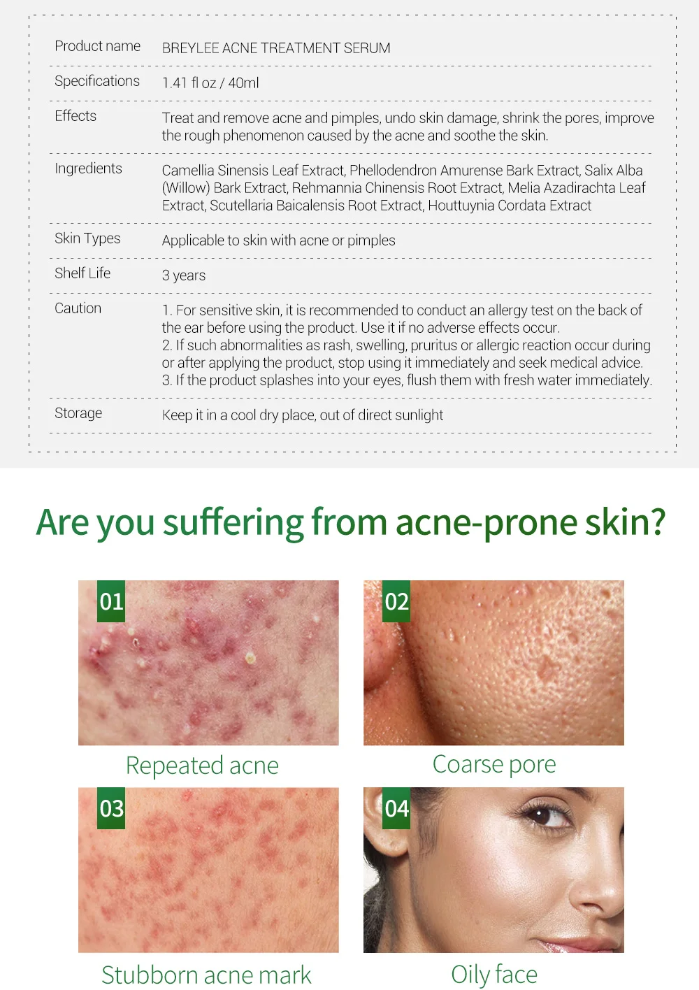 Типы кожи: подходит для кожи с акне или прыщамиСрок годности: 3 годаВнимание: 1. Для чувствительной кожи рекомендуется провести тест на аллергию на задней части уха перед использованием продукта. Используйте его, если не происходит никаких побочных эффектов.2. Если такие аномалии, как сыпь, отек, зуд или аллергическая реакция происходят во время или после применения продукта, прекратите его использование немедленно и обратитесь за медицинской помощью.3. Если продукт брызгает в ваши глаза, немедленно промойте их пресной водой.Хранение: держите его в прохладном сухом месте, вне прямых солнечных лучей