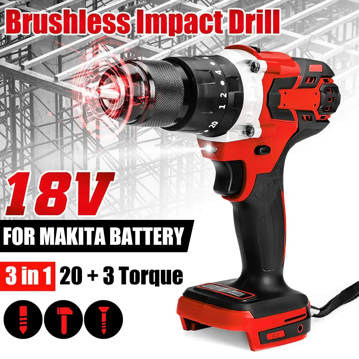 Бесщеточная электрическая отвертка 3 в 1, дрель с крутящим моментом 20 + 3, 13 мм, беспроводная ударная дрель, молоток светодиодный светильник кой для батареи Makita 18 в