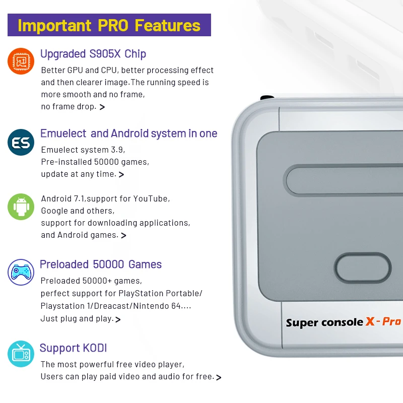 Флуоресцентный Модернизированный чип S905X: лучший Графический процессор и процессор, более Плавная скорость обработки и скорость работы. Двойная система в одном: Emuelect и система Android в одном, вы можете проверить информацию, установить Android игры, использовать функцию TV box и скачать приложения, такие как Google. 50000 + игры: загруженные 30000-50000 игры, поддержка PSP/DC/N64/NDS. Поддержка KODI: самый мощный видео бесплатный видео плеер