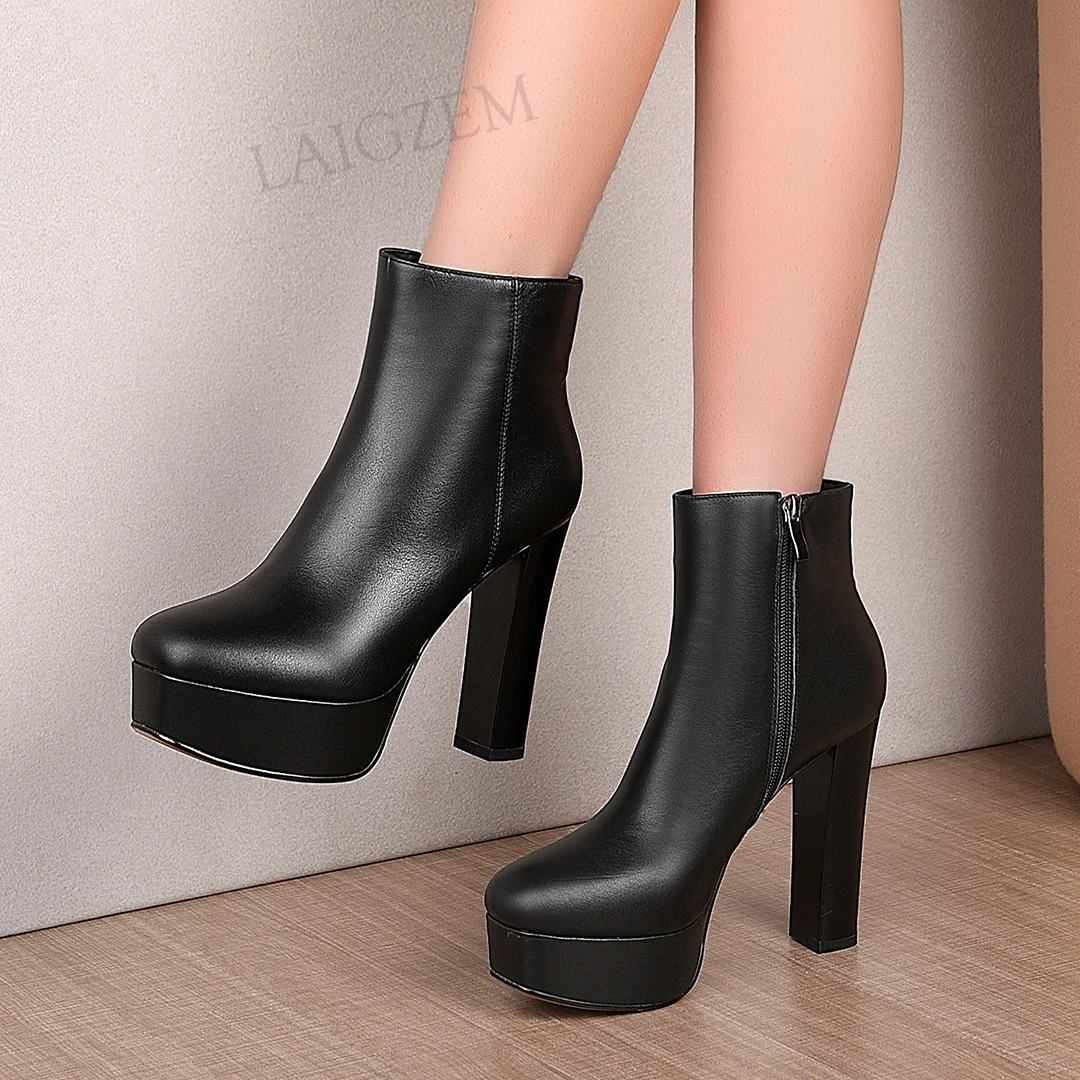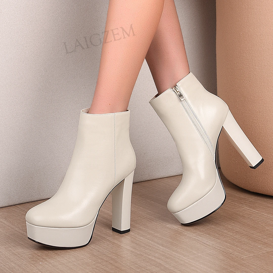 LAIGZEM/женские ботильоны; Ботинки из натуральной кожи на высоком квадратном каблуке с боковой молнией; Цвет бежевый, черный; Donne Stivali; Женская обувь; Размеры 33, 37, 38, 39