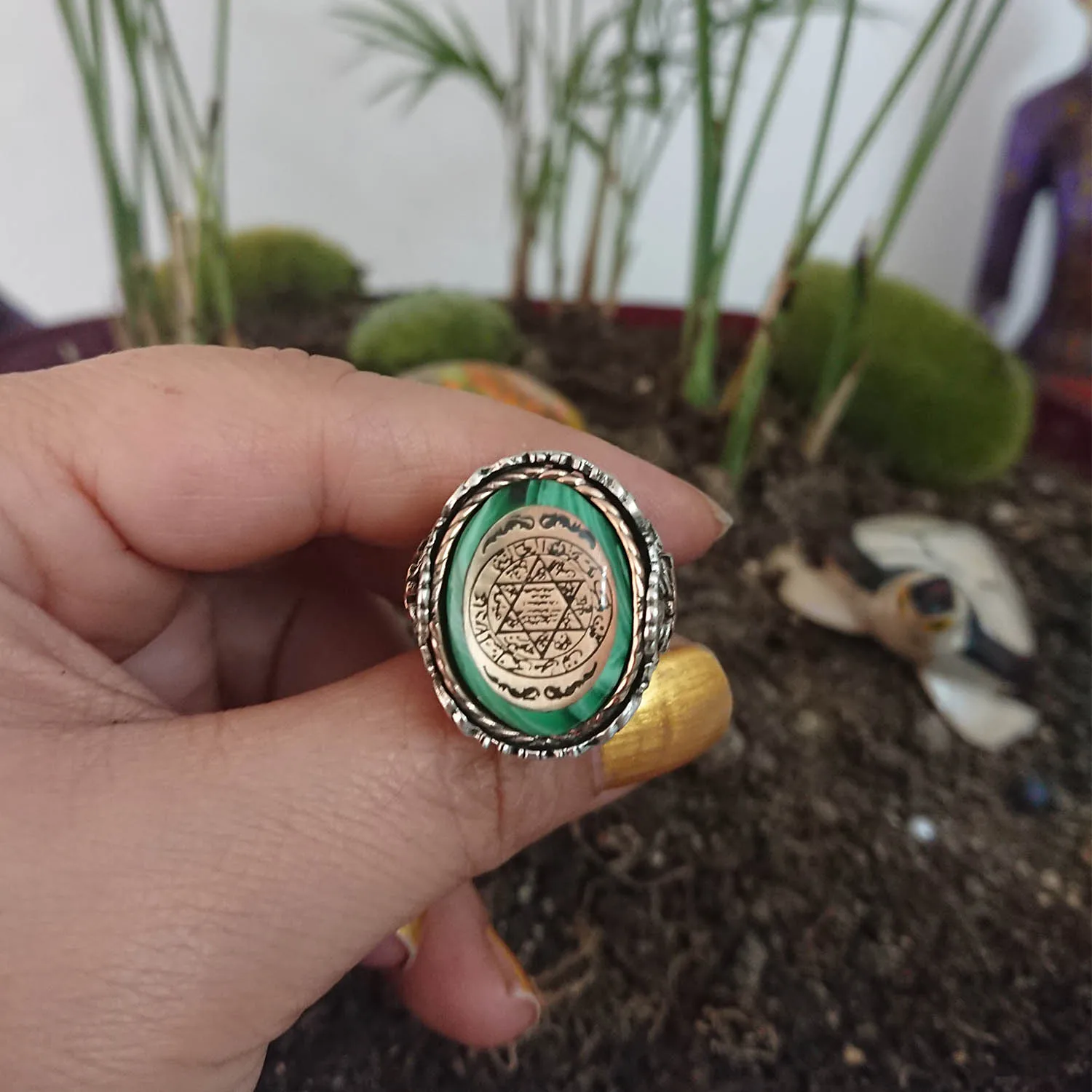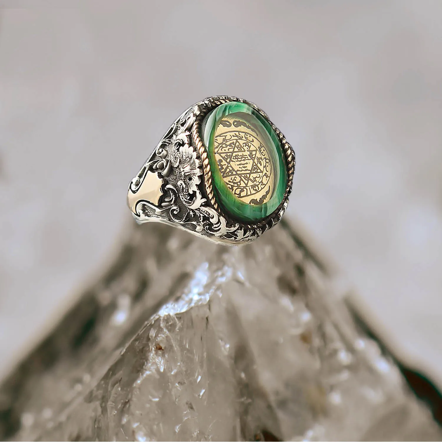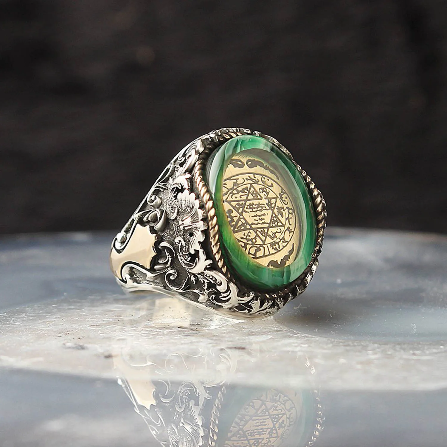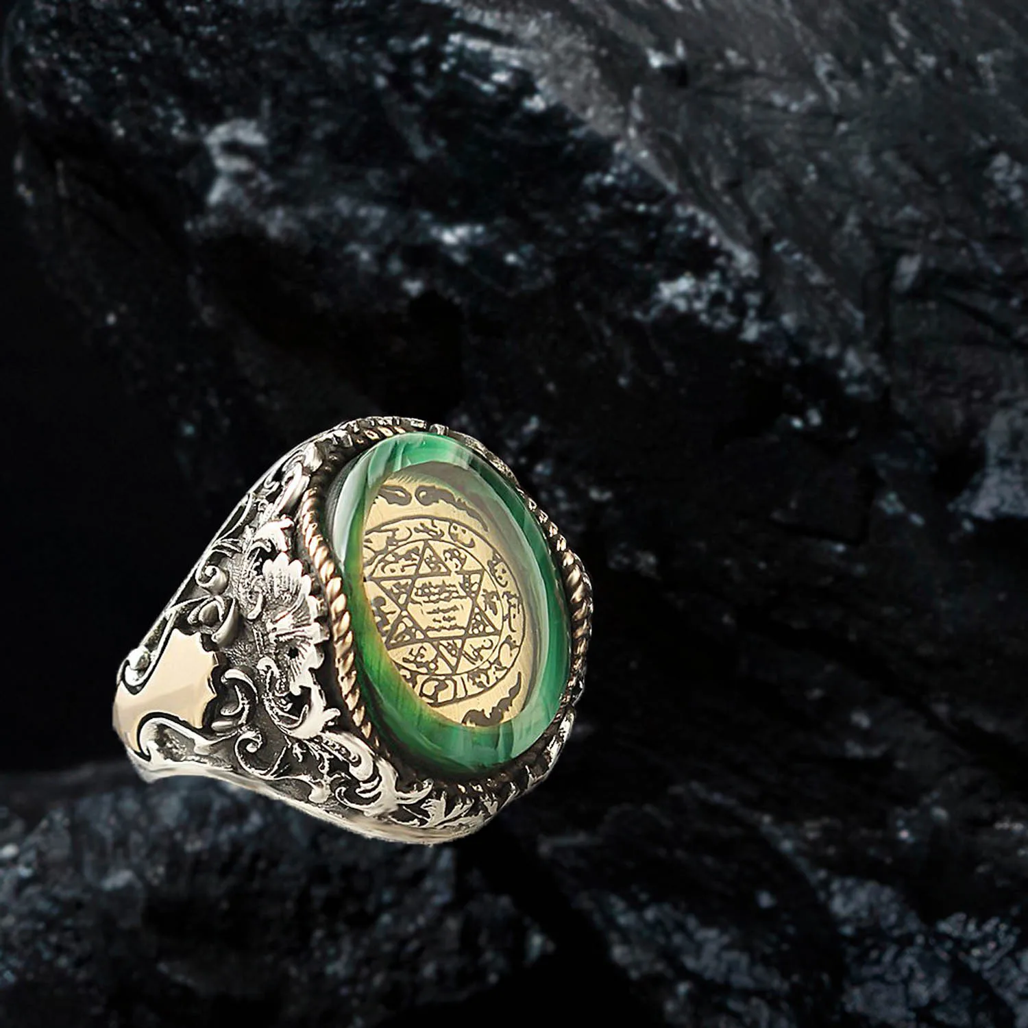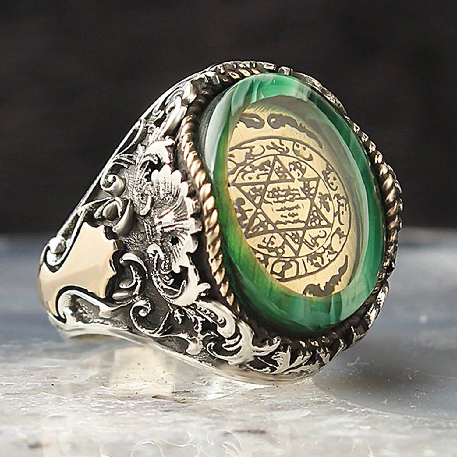 Цвет: зеленыйМужское кольцо из зеленого янтарного камня золотого цвета King Solomon's Seal разработано вручную 925 пробы серебряного цвета.