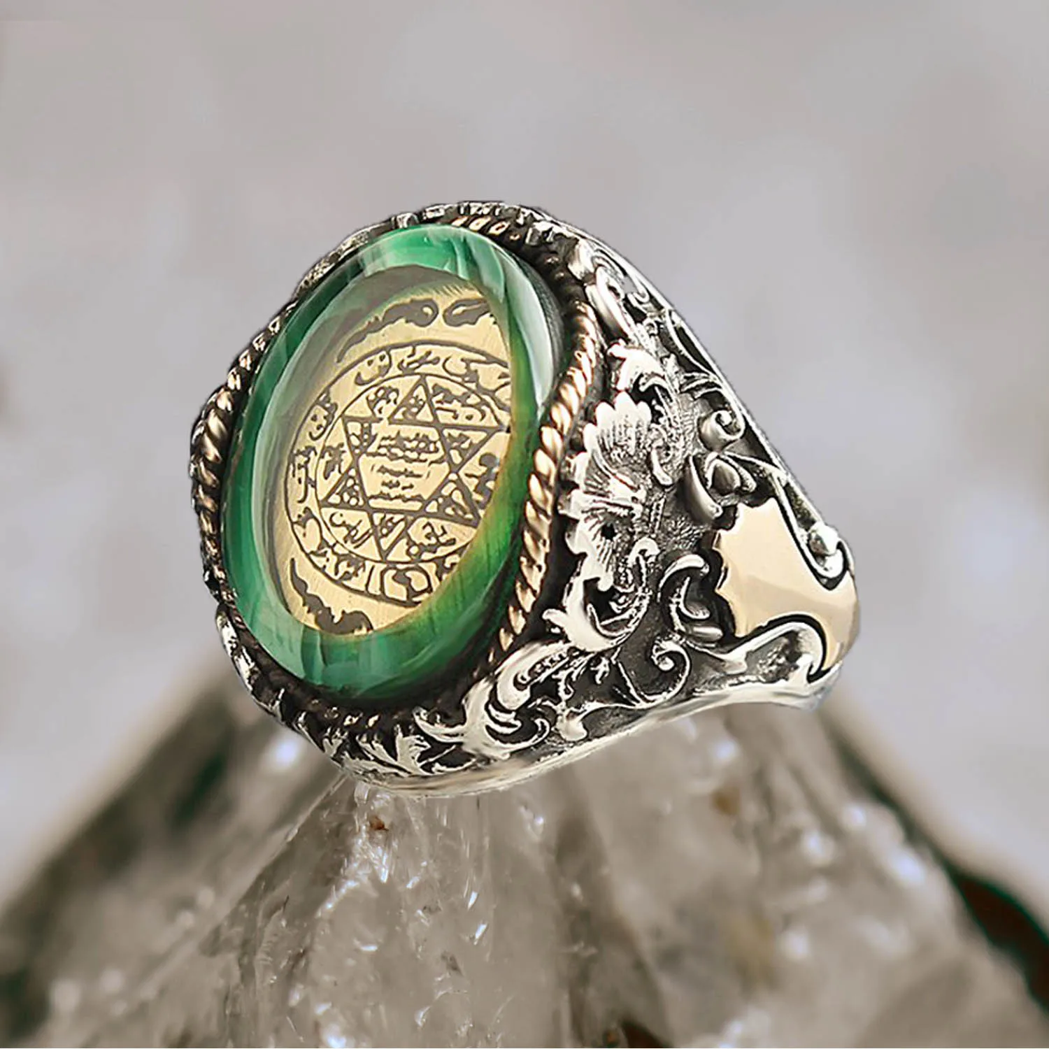 Мужское серебряное кольцо KING SOLOMON'S SEAL, зеленое и Янтарное кольцо золотого цвета, ручная работа, модные ювелирные украшения из стерлингового серебра 925 пробы