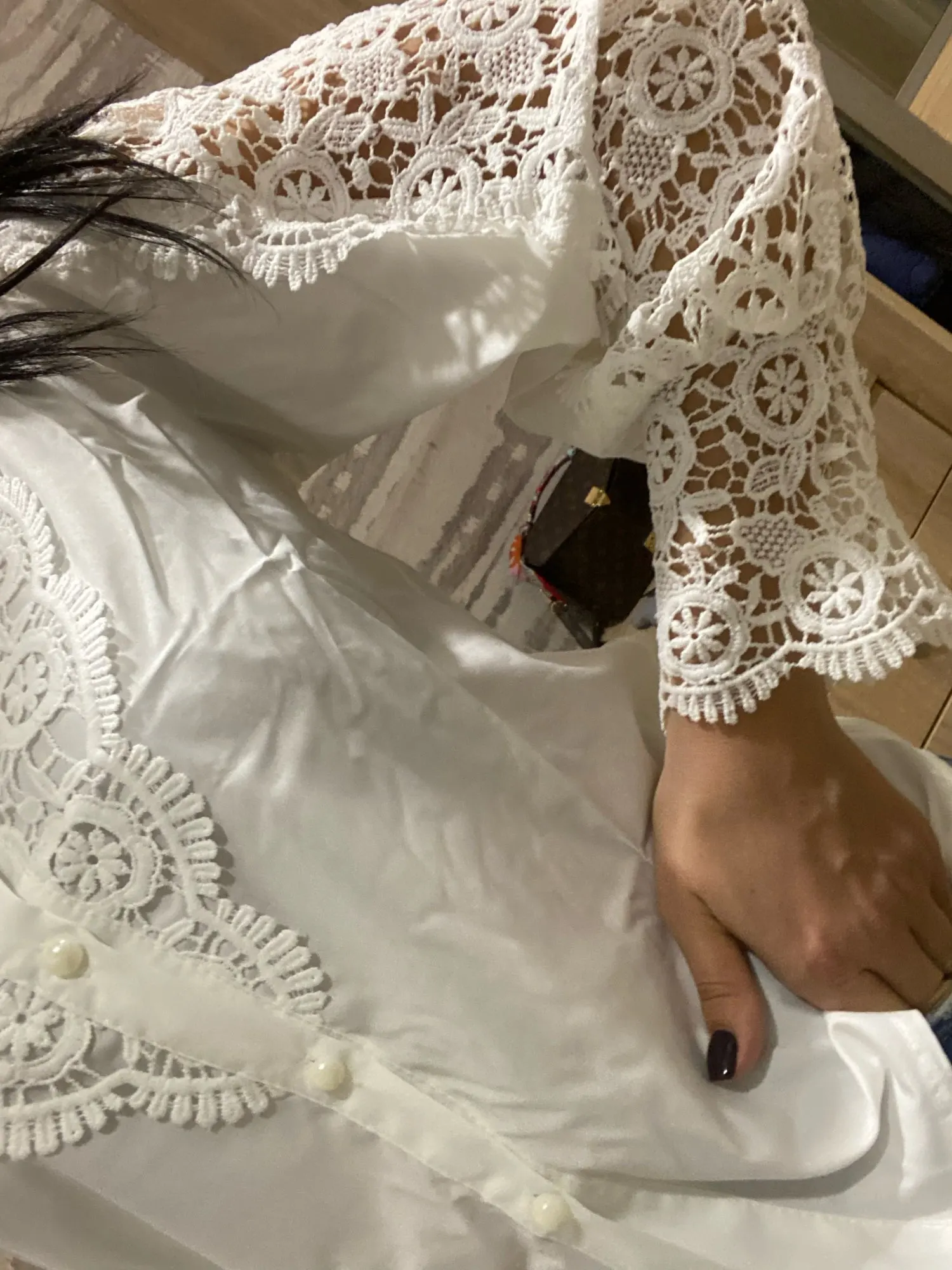 Блузка відрізняється від фото. Рукава не на манжеті з гудзиком, а просто пришито кружево, тому внизу дуже широко і прийдеться пришивати гумку, щоб тримало. Сама тканина і кружево- синтетика. На фото виглядає красивіше. XXL підійшло на 50 розмір. Продавець довго не відправляв. Спочатку показувало повернення, але все таки дійшло до України.