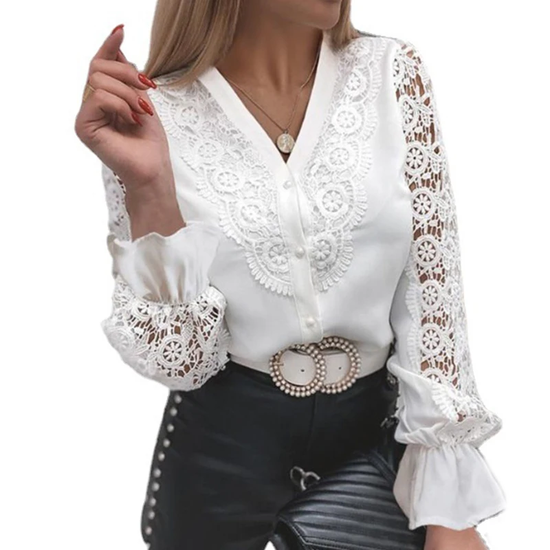 Женская кружевная блузка, белая ажурная блузка с длинным рукавом, с пуговицами, сетчатая, весна 13267