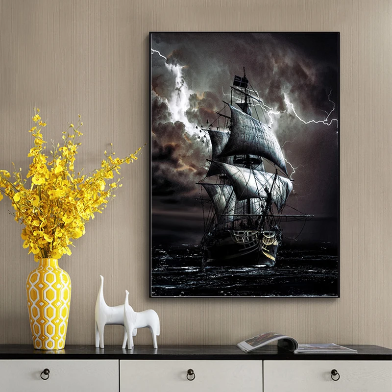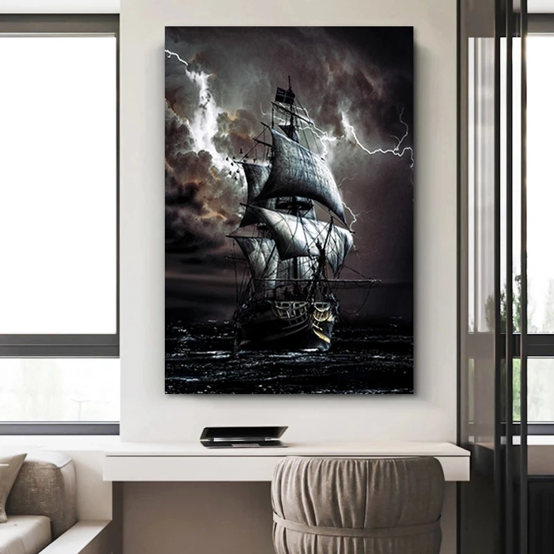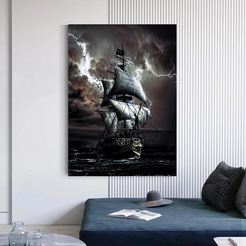 Черная парусная лодка винтажный пиратский корабль в море картины на холсте фотография стены для гостиной без рамки