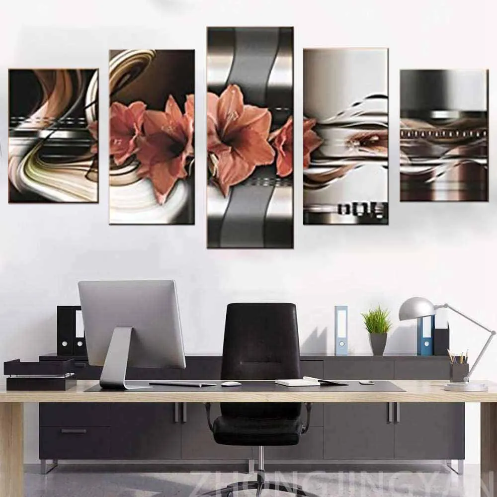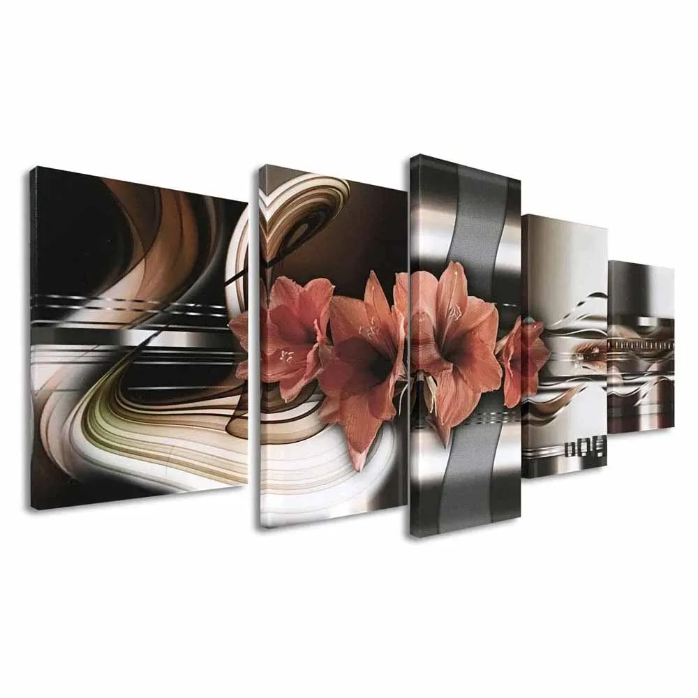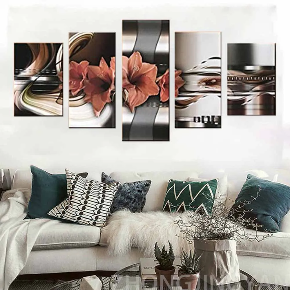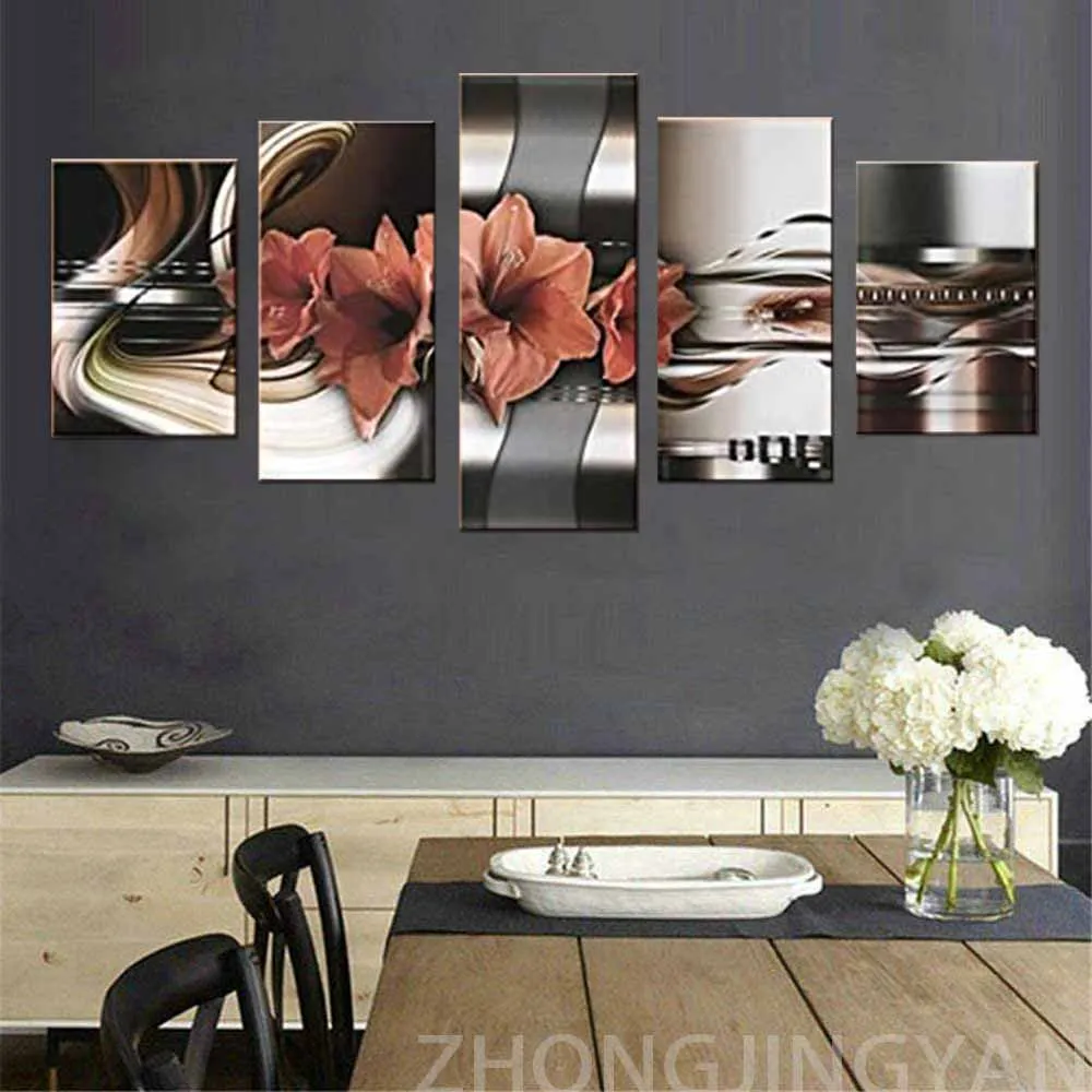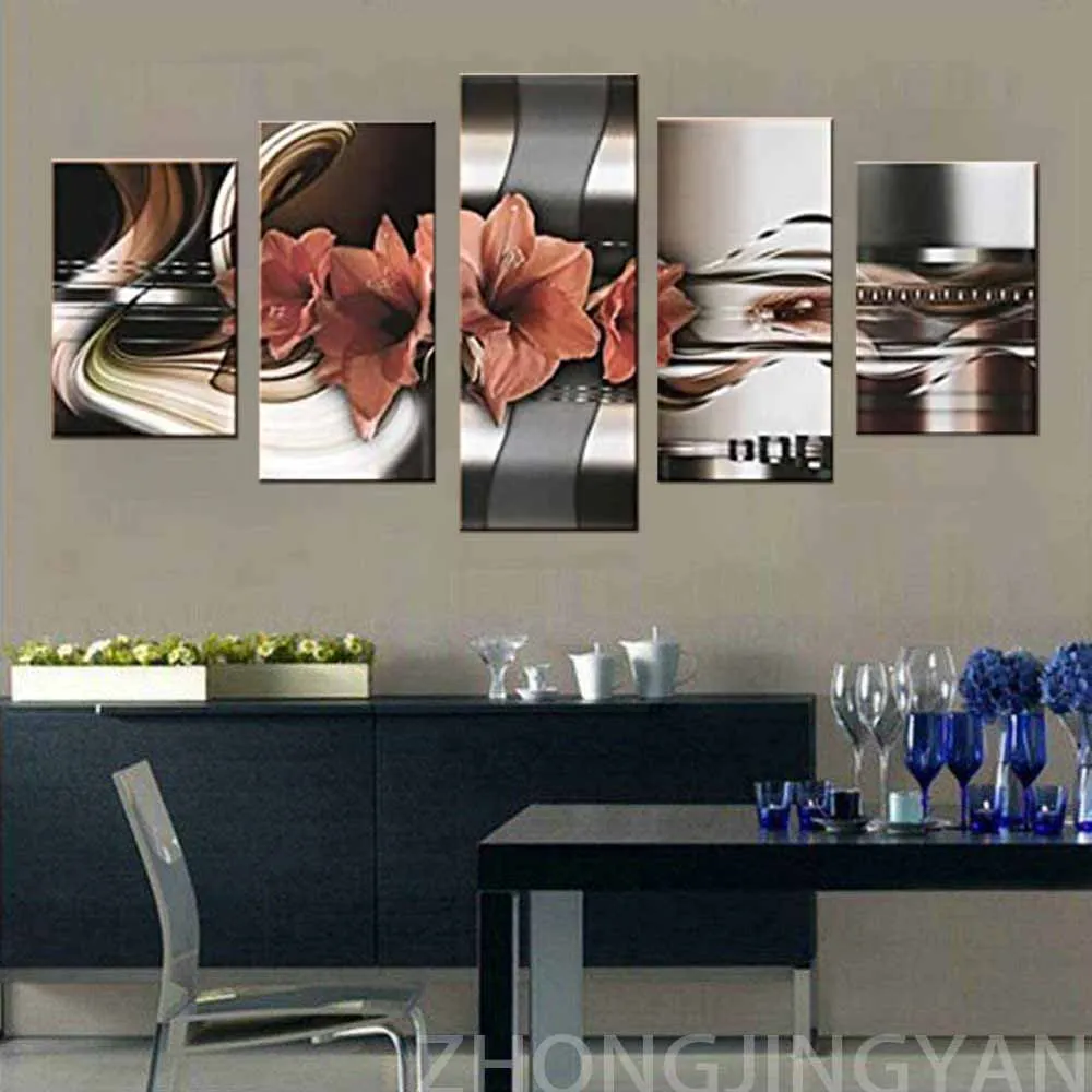 Большие 5 панелей, красные цветочные принты, настенное искусство, современное художественное полотно, современная абстрактная картина с цветами, декор для гостиной, столовой
