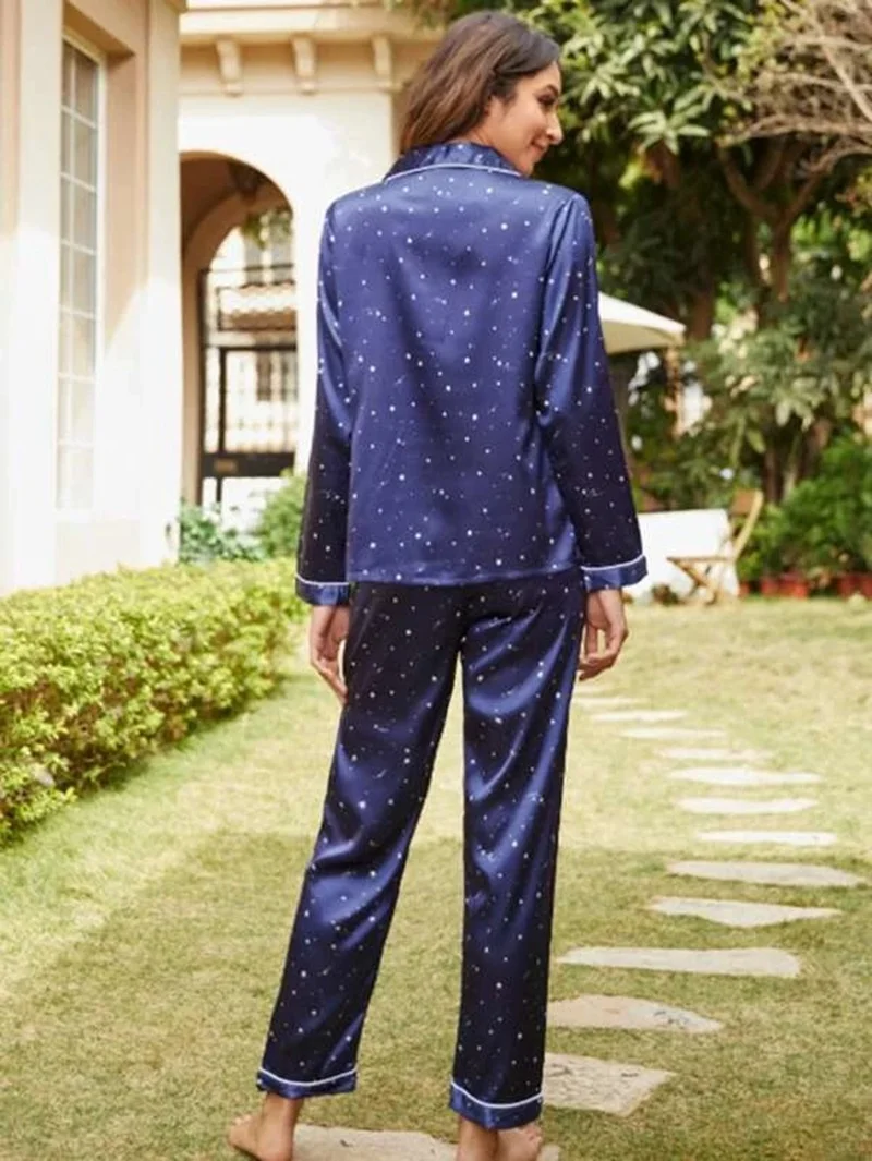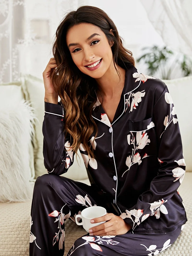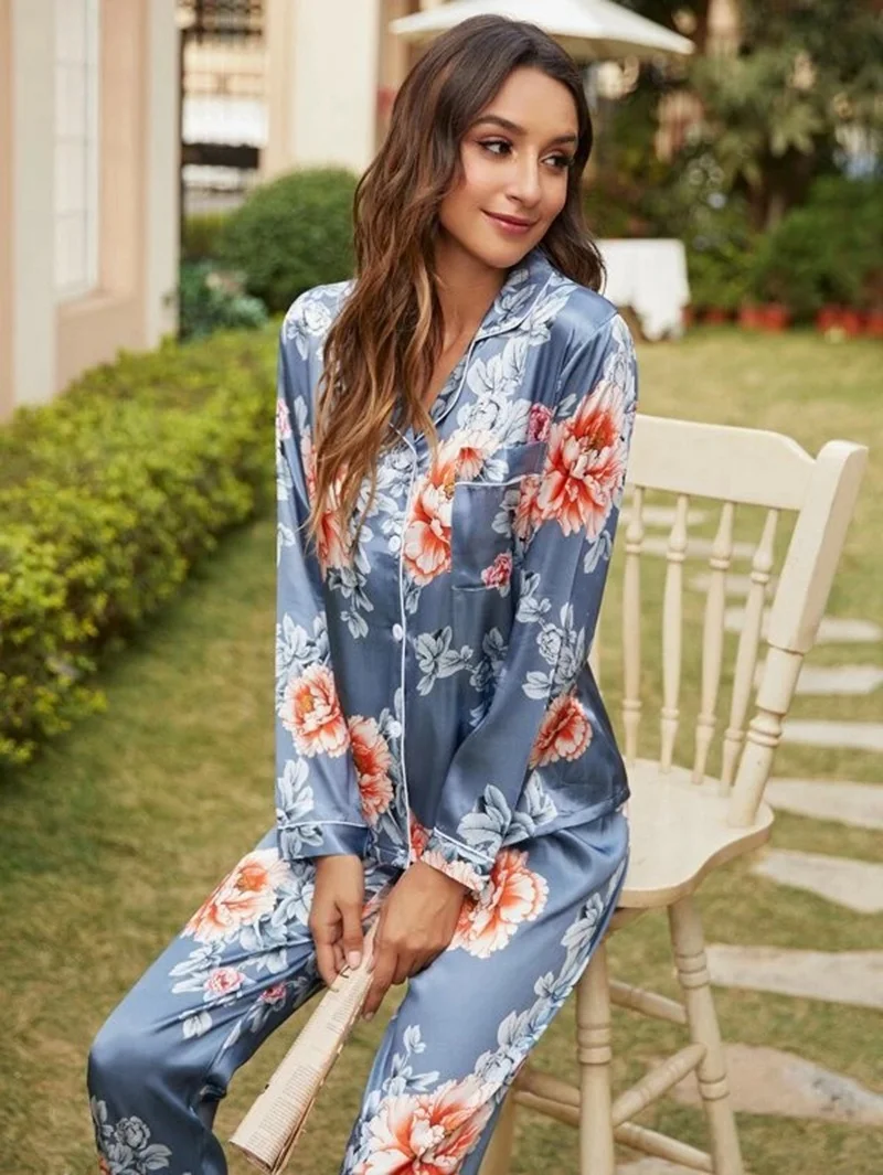 Женский пижамный комплект, шелковая атласная одежда для сна, Женская Повседневная Ночная рубашка с длинным рукавом и карманами, на пуговицах, длинные штаны, пижамные комплекты