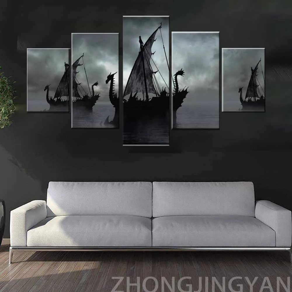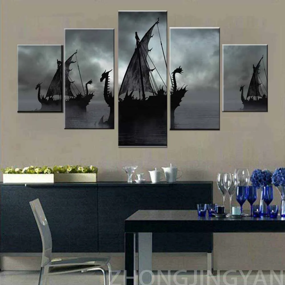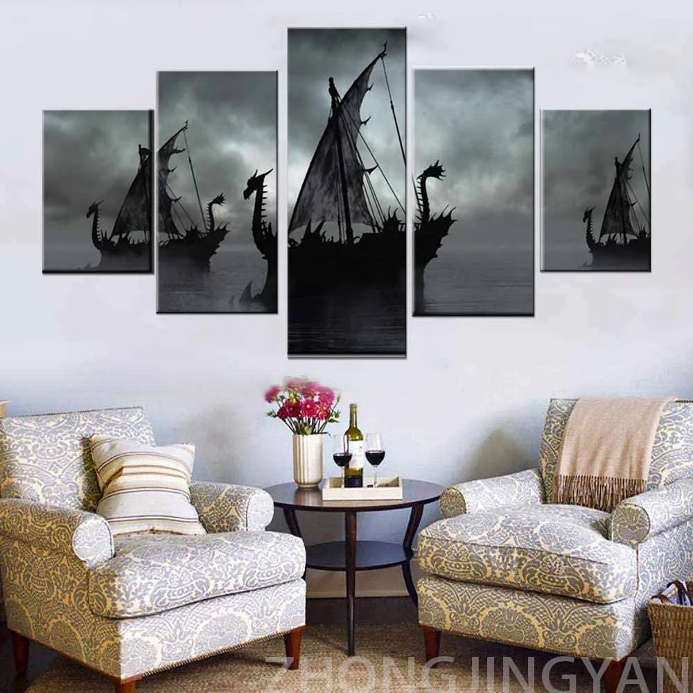 Картина черно-белая, Парусный корабль, произведение искусства, фэнтези, лодка, картины для гостиной, 5 панелей, дракон, холст, настенное искусство, современный дом D