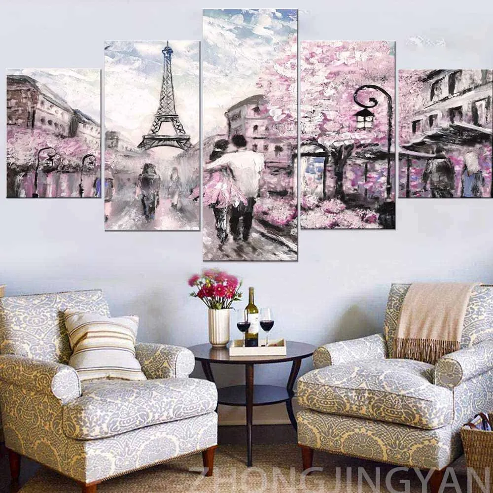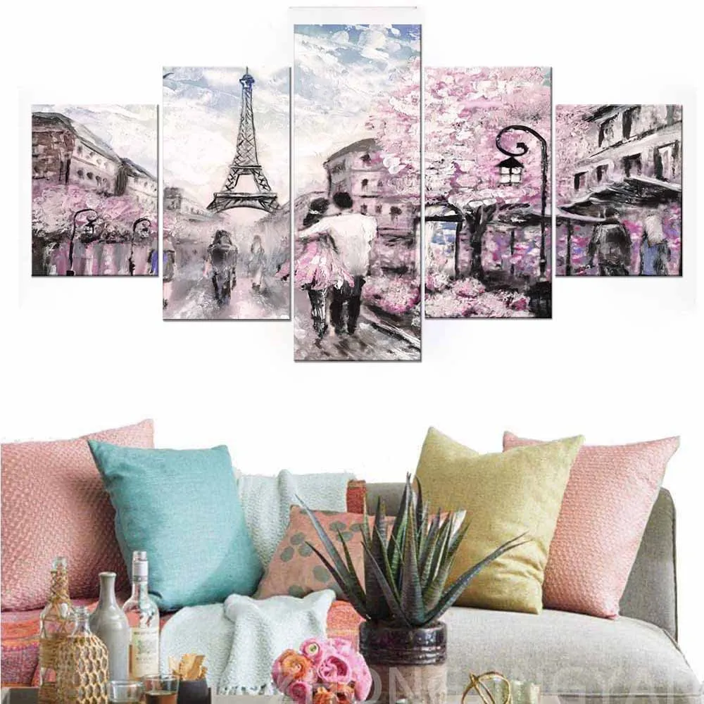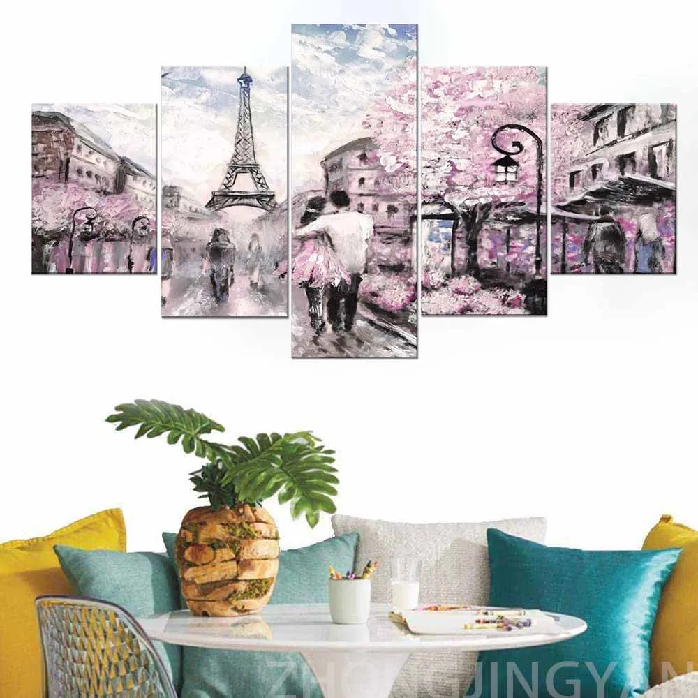 5 панелей для пары, Эйфелева башня ходьба под дождем, романтический Париж, Настенный декор для спальни, Картина на холсте с рамкой, настенное искусство для L
