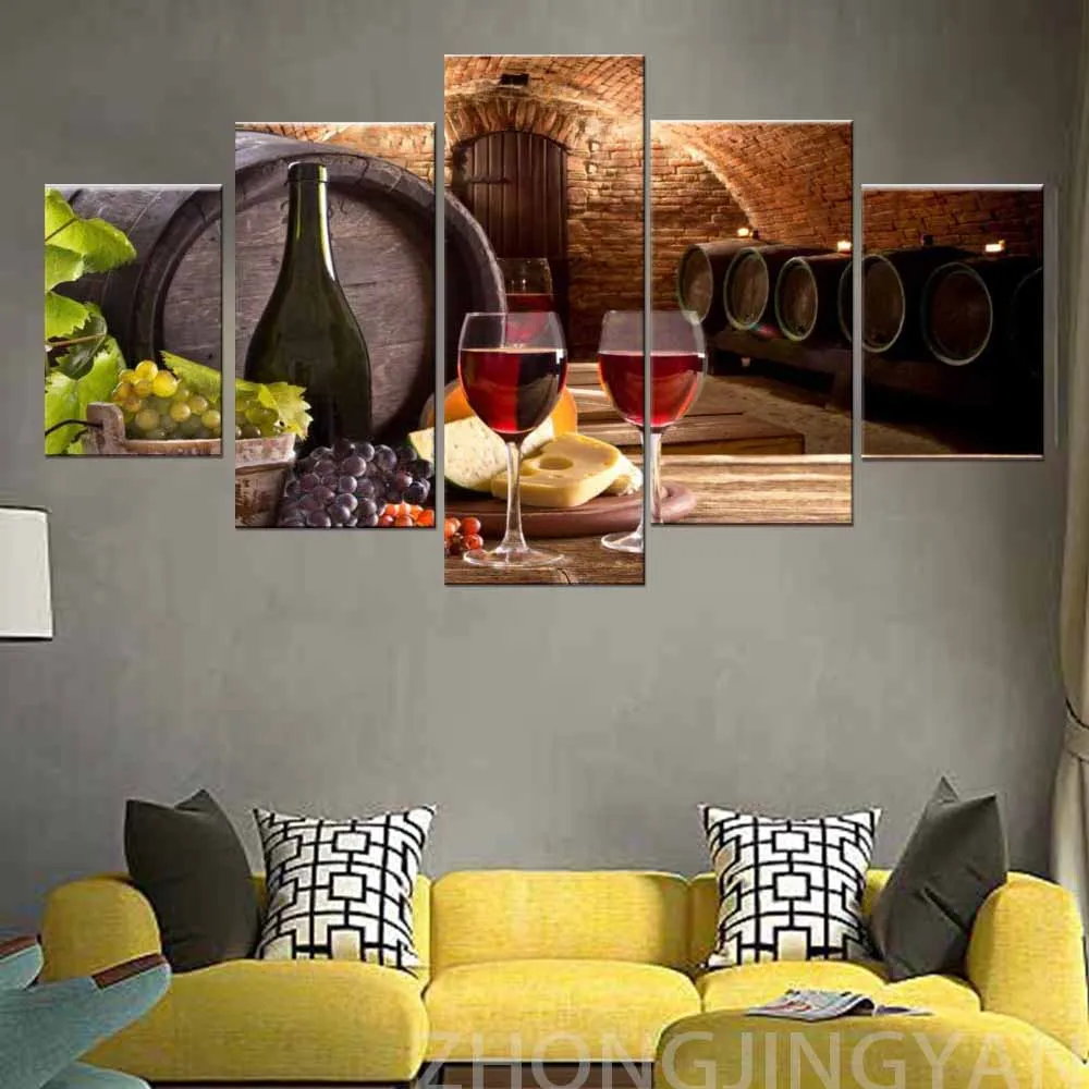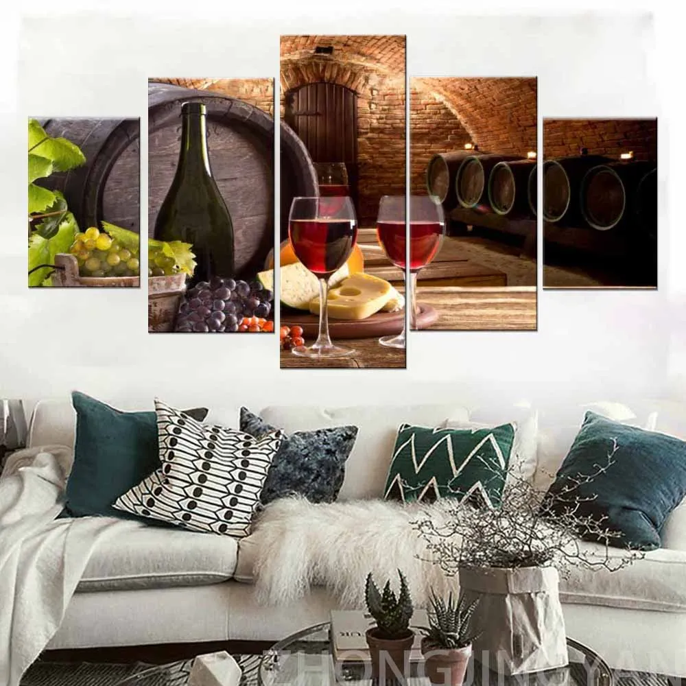 Настенная картина для кухни, изображения красного вина, деревянного бочонка и фруктов, винограда, картина для гостиной, 5 панелей, холст, художественный дом