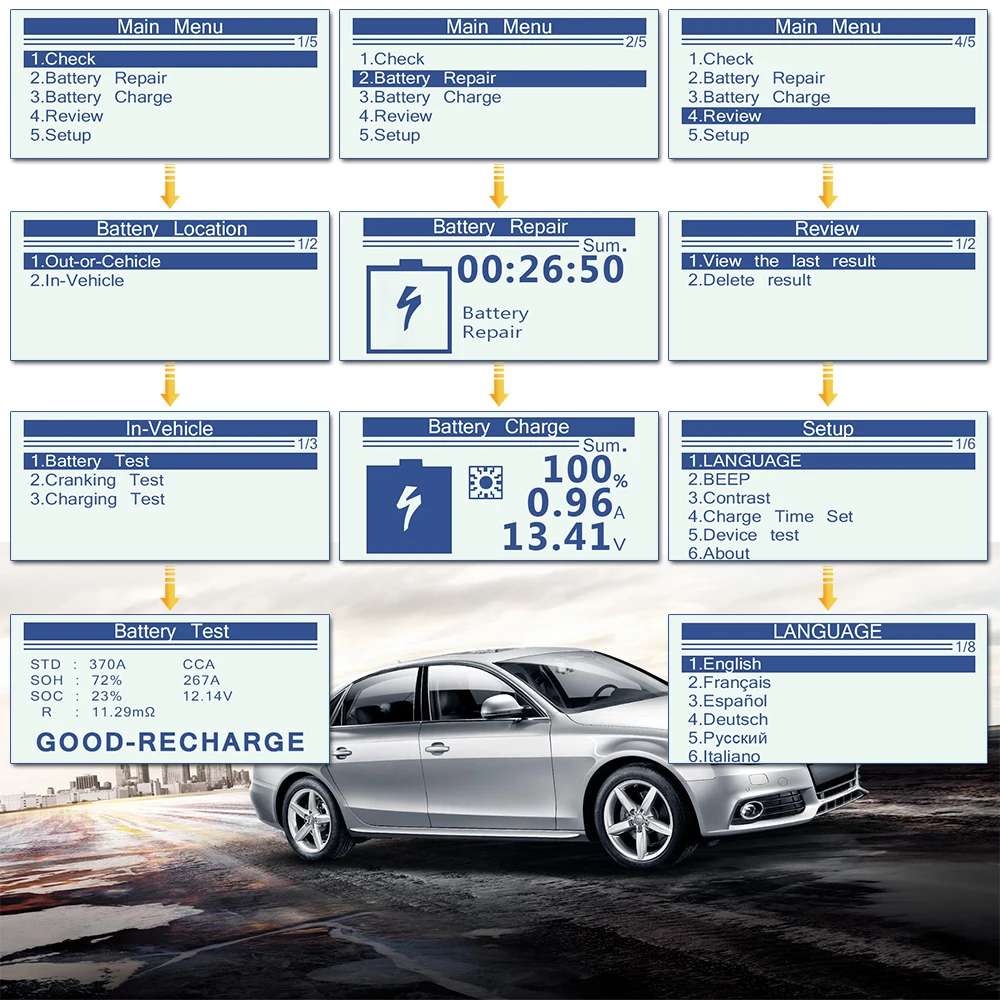 Точный тестер аккумуляторной батареиВаш аккумулятор работает годами, но не имеет представления о его состоянии?Тестер аккумулятора KW510 12 В обеспечивает вам общий анализ состояния аккумулятора, проверяя его заряд напряжения, внутреннее сопротивление затем подает вам, нужно ли заряжать аккумулятор или нет.1. Напряжение системы 12 вольт и тест напряжения, дайте вам результаты о состоянии заряда (SOC) и состоянии здоровья (SOH)2. Результаты тестирования, хорошая подзарядка или замена3. Емкость холодных коленчатых усилителей (CCA), DIN, EN и IEC информация относительно батареи.Значение внутреннего сопротивления (mΩ) и срок службы в % (SOH)4. Испытание системы сгибанияПроверка и анализ пускового двигателя. Тестирование фактического требуемого тока скручивания и напряжения скручивания пускового двигателя помогает определить, работает ли Пусковой двигатель правильно или нет.5. Испытание системы зарядкиПроверка и анализ системы зарядки аккумулятора транспортного средства, включая генератор, выпрямитель, выпрямительный диод и т. д., таким образом, чтобы узнать, является ли выходное напряжение генератора нормальным, диод выпрямителя работает исправно и абнормалы.6. Запись и просмотр данных батареи.7. Основные Стандарты батареи CA,CCA,BCL,MCA,JIS,SAE,EN,DIN и IEC поддерживаются