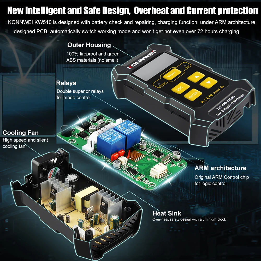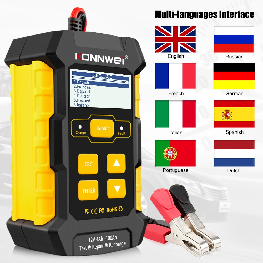 Все-в-одном решение батареи KONNWEI KW510KONNWEI KW510-это профессиональный тестер нагрузки батареи, зарядное устройство, Ремонт батареи (импульсный ремонт), струйное зарядное устройство и осушитель батареи.С тестером батареи KONNWEI высокой точностью характеристики, KW510 расчесывает зарядку и ремонт батареи функции и перепроектирует продукты, делает все-в-одном инструмент обслуживания батареи, whcih очень полезен и сокращает вашу работу, и это должен иметь инструмент для всех владельцев автомобилей.