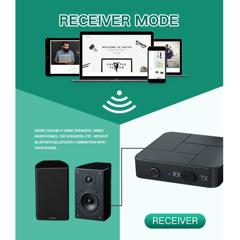 100% новый и высокое качествоOOTDTYОсобенности:1. Этот Чрезвычайно портативный, легкий беспроводной передатчик и приемник-идеальное беспроводное аудио решение для широкого спектра ситуаций и использования2. Режим передатчика: Беспроводная передача аудио с вашего телевизора, не Bluetooth, домашней стереосистемы или плеера на наушники или колонки Bluetooth3. Режим приемника: Беспроводная передача аудио с телефона, планшета или компьютера с поддержкой Bluetooth на проводную стереосистему, динамики или наушники4. Переключение между режимами передатчика и приемника с простым щелчком переключателя. Легко подключить, используя передовые технологии Bluetooth и 3,5 мм аудио кабель (все указанные аккумуляторы входят в комплект поставки).5. Супер-портативная потоковая мощность аудиоKN326 всего 44 мм (1,73 дюйма) и весит всего 18 г (0,63 унций), но имеет мощные возможности беспроводной потоковой передачи аудио. Вставьте этот передатчик и приемник в рюкзак или сумку для ноутбука и возьмите его на ходу без каких-либо усилий.6. Широкая Совместимость: с помощью прилагаемого 3,5 мм кабель и 3,5 мм до 2RCA кабель, этот приемник передатчик адаптер может широко использоваться на вашем компьютере, ноутбук, домашней стереосистеме, бумажное полотенце, кабель для наушников, смартфон, MP3-плеер и т. Д.Включение питания: Нажмите и удерживайте кнопку включения/выключения, пока светодиодный индикатор не загоритсяВыключение: Нажмите и удерживайте кнопку включения/выключения, пока светодиодный индикатор не выключитсяЗарядка: используйте зарядное устройство DC-5V и зарядный кабель micro usb. Красный светильник включен во время зарядки. Когда аккумулятор полностью заряжен, включается синий светильник.Режим переключения:1)RX: режим приема, индикатор: синий светодиодный2)TX: режим передачи сигнала, индикатор светильник: Красный светодиодныйРежим RX:Имя сопряжения: KN326, найдите KN326 в настройках Bluetooth телефона для сопряжения. Синий светильник мигает дважды в секунду во время процесса сопряжения, и синий светильник мигает один раз в три секунды после успешного сопряжения.Как использовать:1) Вставьте один конец аудиокабеля в аудиовход динамика, а другой-в аудиофайлы KN3262) подтвердите, что он находится в режиме RX (синий светильник-вспышка). Найдите Имя сопряжения в настройках Bluetooth телефона: KN326 нажмите для сопряжения.Режим TX:Режим TX будет автоматически искать другие устройства приема Bluetooth (такие как bluetooth-гарнитура, bluetooth-динамик, bluetooth-приемник и т. д.), Красный светильник Дважды Мигает во время процесса сопряжения, И Красный светильник мигает раз в три секунды после успешного сопряжения.Как использовать:1) Подключите один конец аудиокабеля к выходу аудиоустройств, а другой-к аудиоразъему KN326.2) подтвердите, что он находится в режиме TX (красный светильник-вспышка). KN326 будет автоматически искать bluetooth-гарнитуру или bluetooth-динамик сопряжения.Громкая связь BluetoothВ режиме приема, этот продукт поддерживает Bluetooth громкой связи. Когда мобильный телефон звонит, нажмите кнопку питания, чтобы ответить на звонок.Спецификация:Модель: KN326Технологии: BT5.0, A2DP, AVRCP (только режим приемника)Рабочий диапазон: до 10 м/33 футов (без каких-либо блокирующих объектов)Название сопряжения: KN326Время зарядки: 2 часаТип батареи: литий-полимерный (200 мАч)Размеры: 44 × 44 × 12 ммВес: 18 гПримечание:Возможны отклонения в 0-1 см вследствие измерений вруч