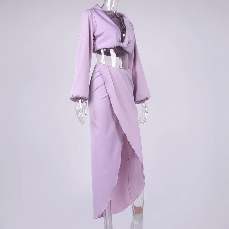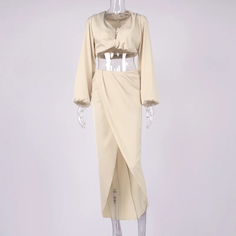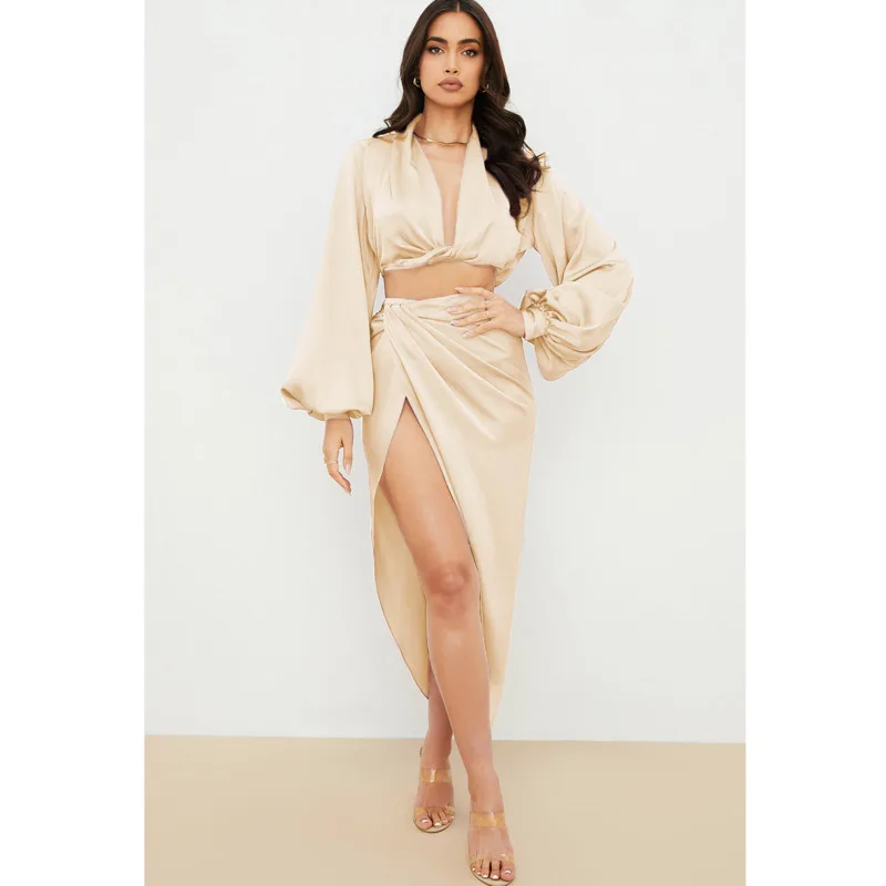Женский атласный костюм из двух предметов, с глубоким V-образным вырезом и юбкой