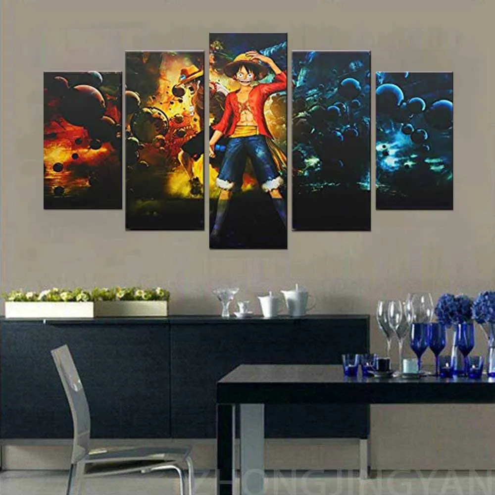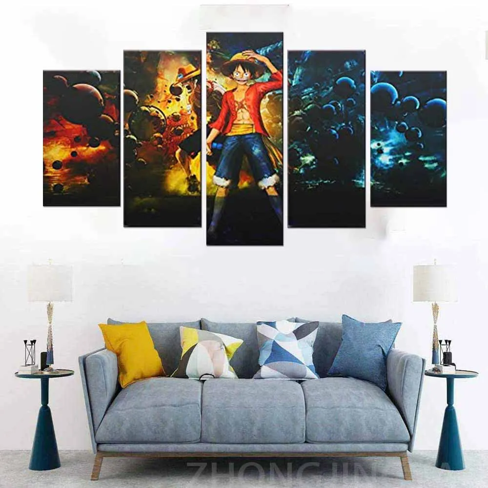 5 панелей Печать на холсте HD настенное искусство One Piece Аниме картины картина Обезьяна D. Настенные постеры Luffy, печать на холсте для домашнего декора