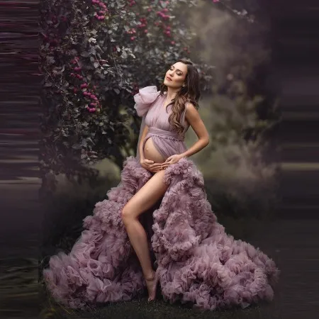 Тюлевые платья с длинным шлейфом для фотосессии беременных с цветоч...
