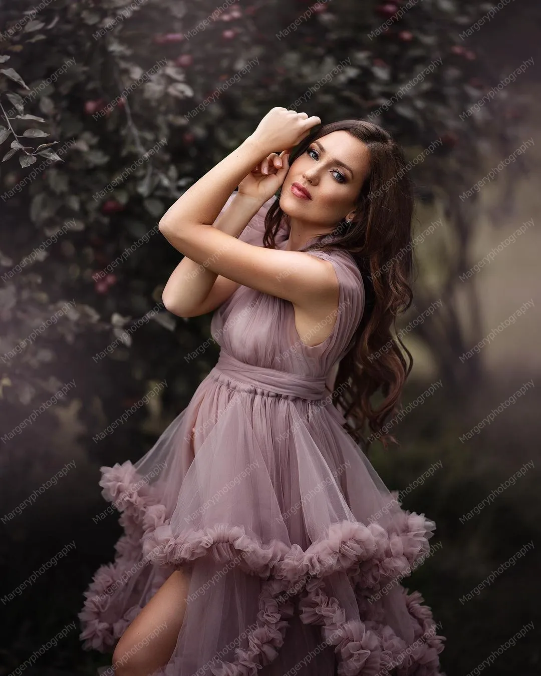 Модное пыльно-розовое Тюлевое длинное платье с оборками для беремен...