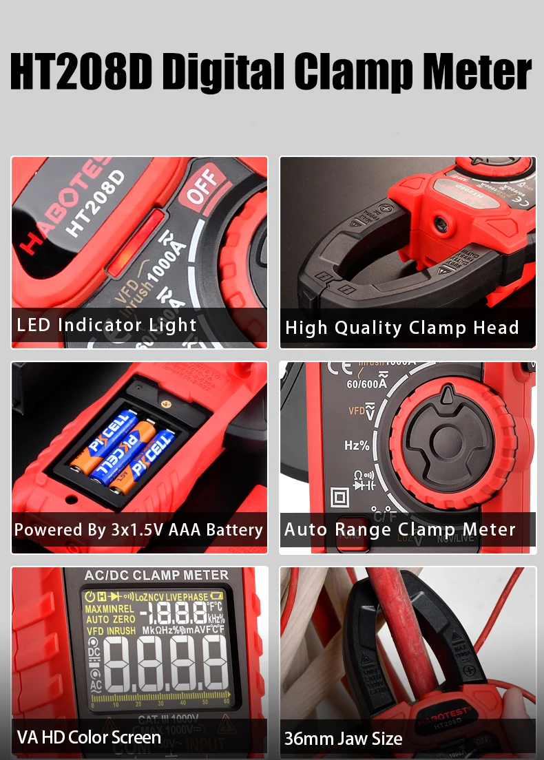 Цифровой мультиметр HT208D, Токоизмерительные клещи, 1000 В, 1000 А, пусковой ток, VFD, тестер емкости и температуры, Ом, ACDC