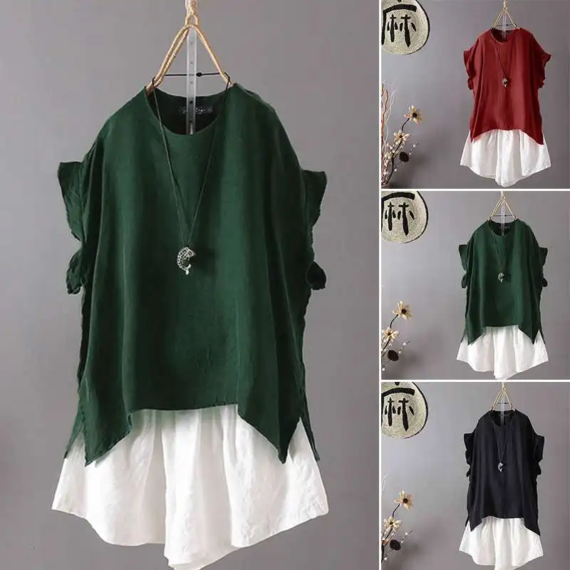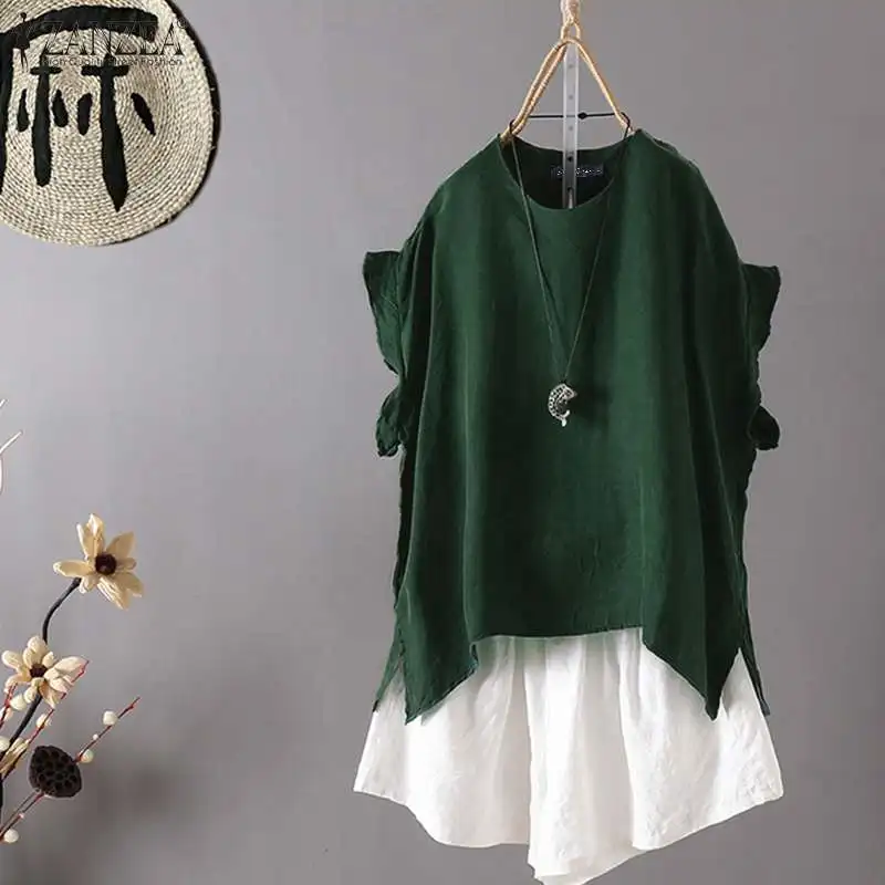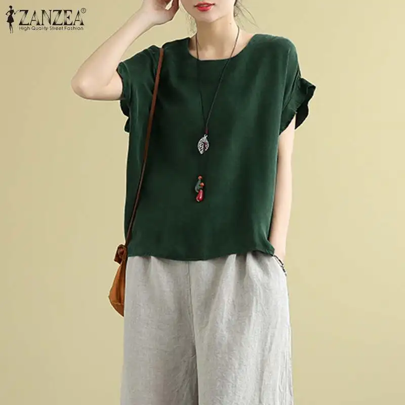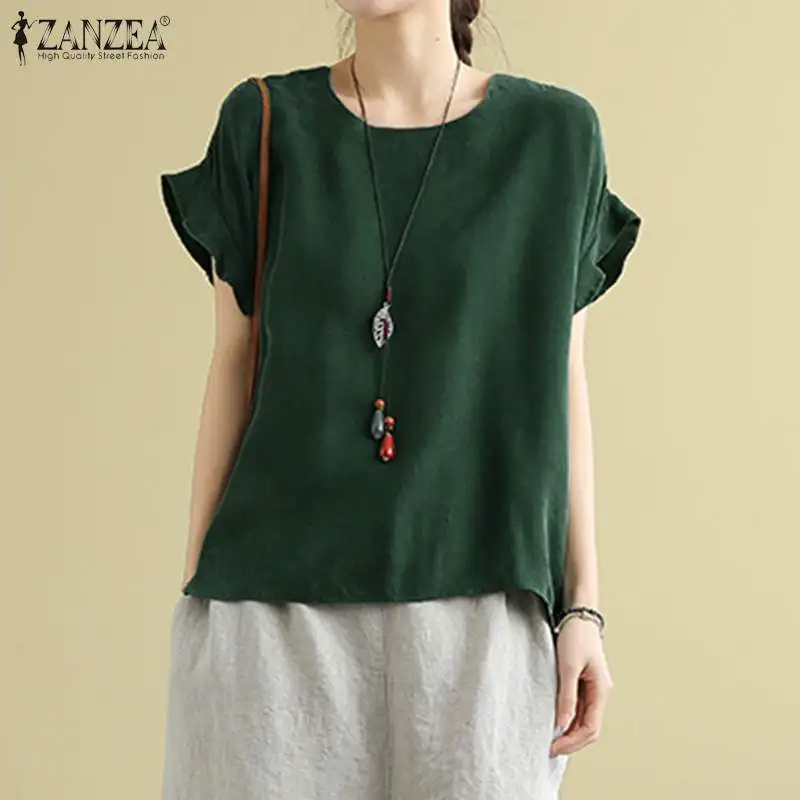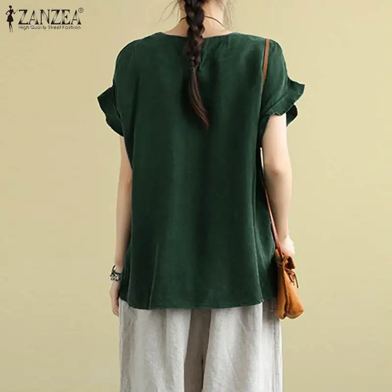 Повседневная Рабочая Рубашка ZANZEA с оборками, модная летняя блузка, Женская туника с коротким рукавом, топы, женские свободные однотонные Блузы 2021