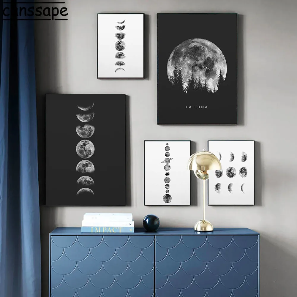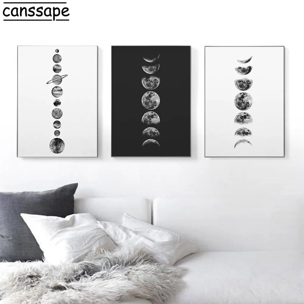 Настенные картины черно-белого цвета, Минималистский плакат, принты фаз Луны, солнечная система, Картина на холсте для украшения гостиной