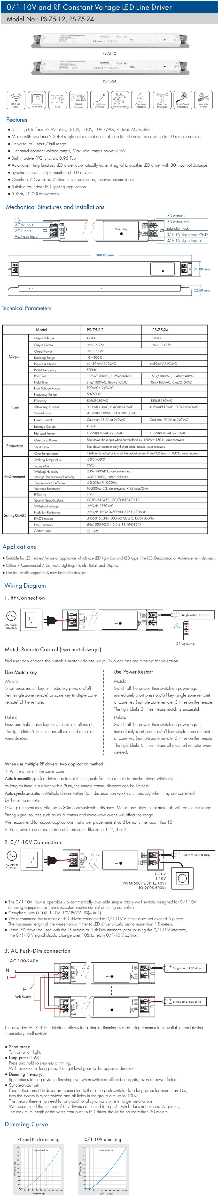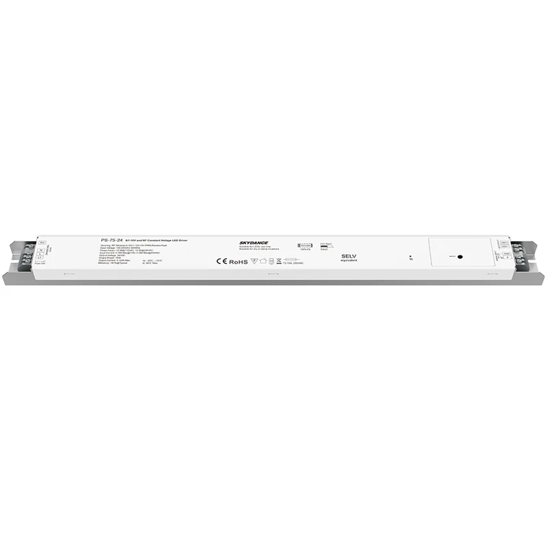 ● Интерфейс затемнения: RF Wireless, AC Push-Dim● Подходит для одного цветного пульта дистанционного управления Skydance 2,4G, один светодиодный радиочастотный драйвер принимает до 10 пультов дистанционного управления● Универсальный вход переменного тока/полный диапазон● 1 канал постоянного напряжения, Макс. Общая выходная мощность 75 Вт● Авто-функции передачи: светодиодный драйвер автоматически передает сигнал к другому светодиодный драйвер с возможностью погружения на глубину до 30 м дистанционное управление● Синхронизация нескольких Светодиодный драйверов● Защита от перегрева/перегрузки/короткого замыкания, восстановление автоматически● Полностью Защитный пластиковый чехол● Подходит для домашнего использования СВЕТОДИОДНЫЙ освещения● 5 лет, 50 000 часов гарантииПримечание: Этот драйвер питания с регулируемой яркостью может сочетаться с дистанционным управлением RF с одним цветным затемнением, пульты должны заказывать saperately