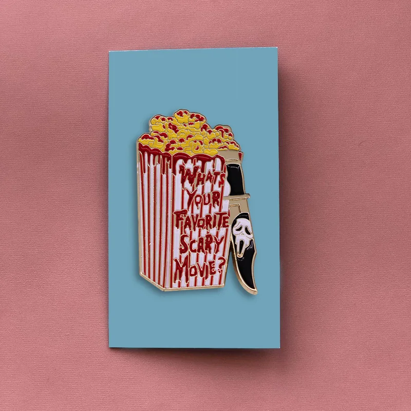 Какой ваш любимый страшный значок из фильма, эмалированный нож в виде кровавого попкорна с черепом, значок, ювелирные изделия