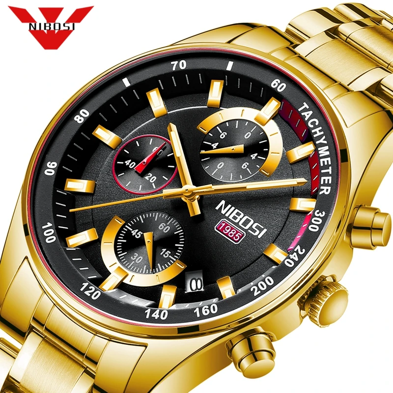 Часы наручные NIBOSI Мужские кварцевые, модные брендовые Роскошные водонепроницаемые спортивные в стиле милитари, с хронографом, золотистые