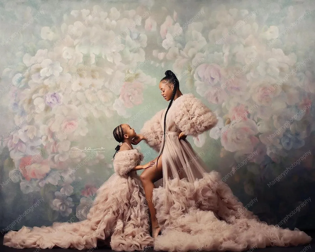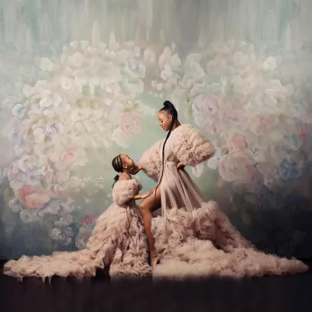 Тюлевые платья с длинным шлейфом для фотосессии беременных с цветоч...