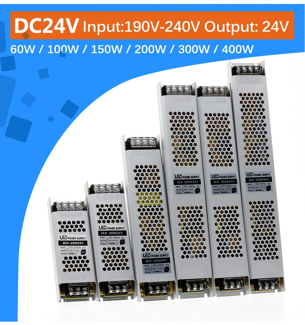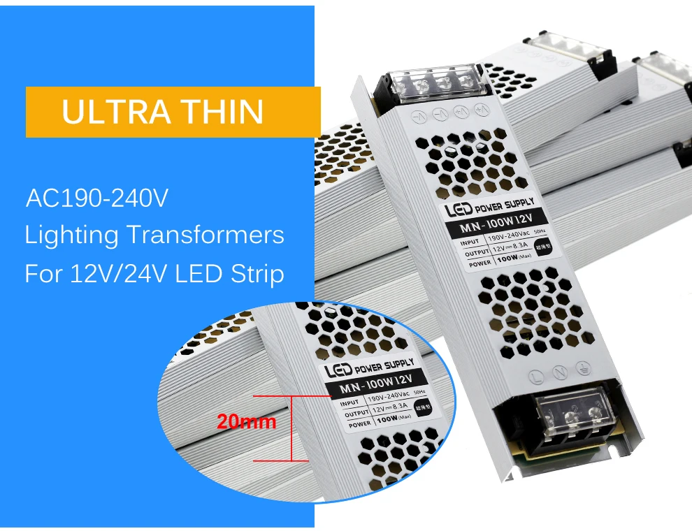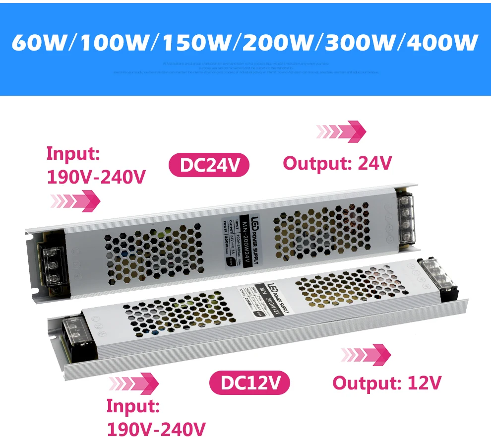 Трансформаторы для освещения, источник питания для светодиодов постоянного тока 12 В, 24 В, 60 Вт, 100 Вт, 150 Вт, 200 Вт, 300 Вт, освещение, ультратонкий, без вентилятора, светодиодный шумный Светодиодный драйвер.