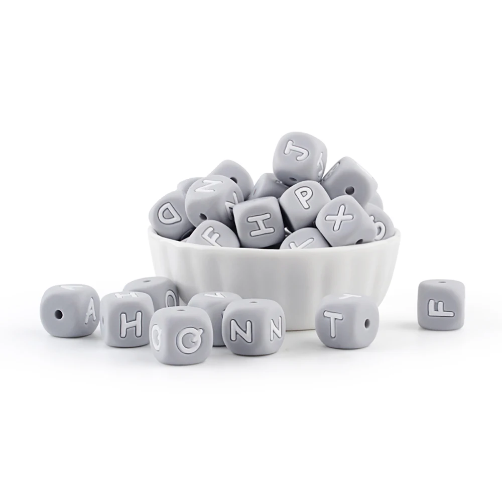 10 шт., силиконовые бусины с буквами, 12 мм, серые Детские Прорезыватели для зубов, игрушки для грызунов, самодельные соски, цепочка для прорезывания зубов, алфавит, пищевая, Детские бусины