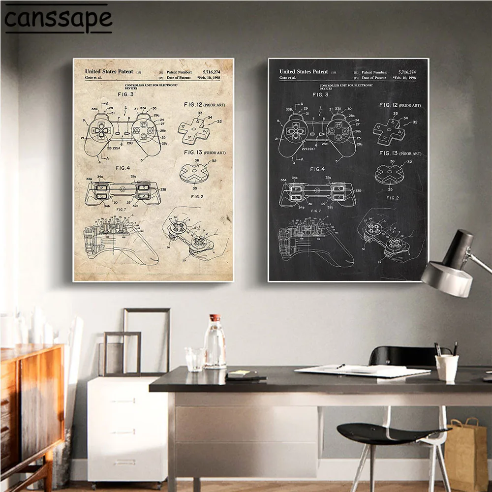 Плакаты для геймпада, игровой контроллер, запатентованные принты, игровой джойстик, настенная живопись, винтажные картины, декор для игровой комнаты