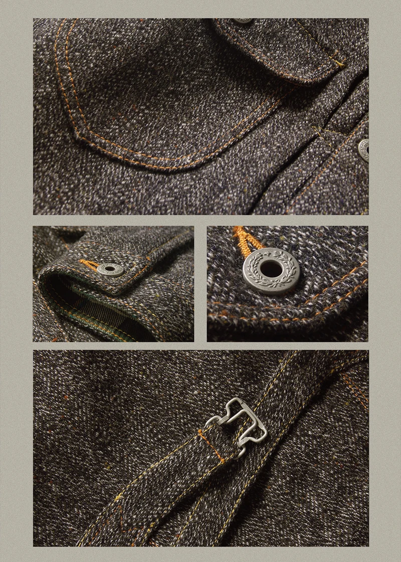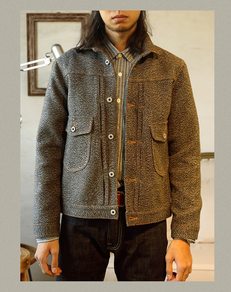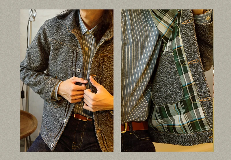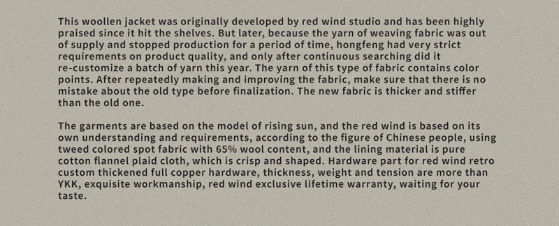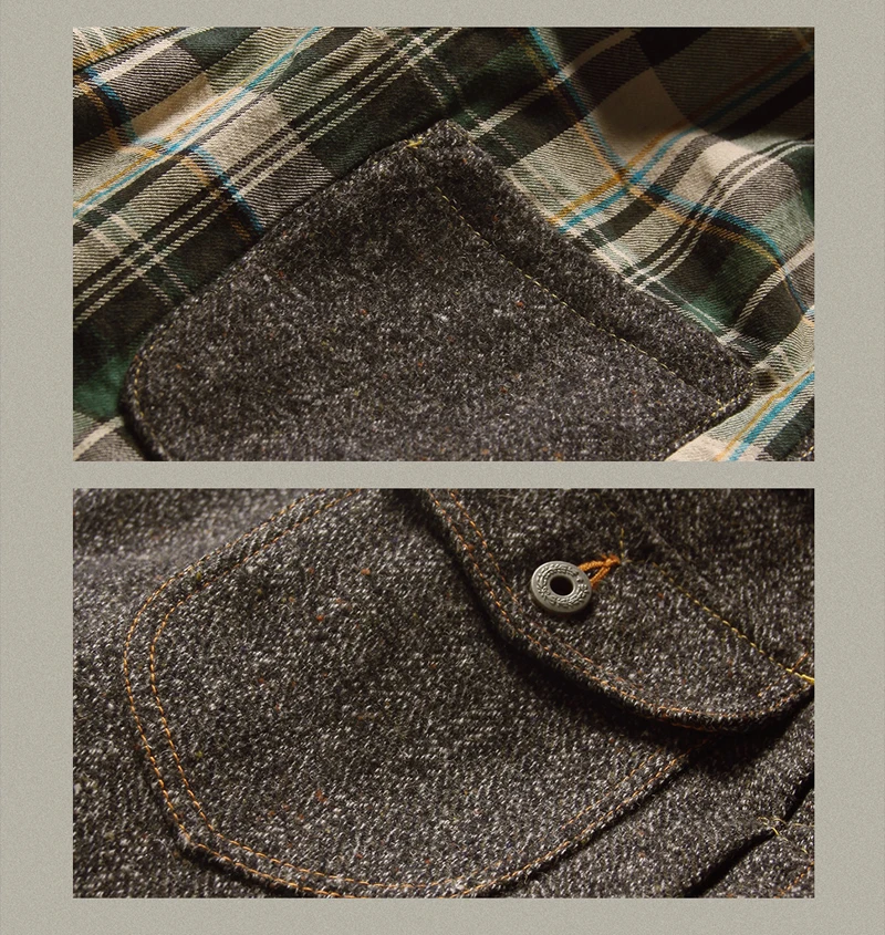 ⏰изготовлен из 65% шерсти, 35% Полиэстера ткани ⏰полностью на подкладке из фланелевой клетки ⏰скручивание двух нитей разного цвета-это то, что придает соли и перца вид ⏰застежка на 5 пуговиц спереди и манжеты на одной пуговице ⏰два кармана с клапанами на пуговицах на талии ⑥ Складки сзади обеспечивают легкость движения во время активной работы ⏰затягивающаяся спинка