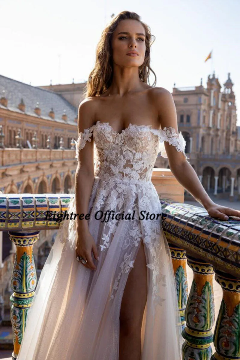 Церковное пикантное свадебное платье цвета шампанского, летние пляжные свадебные платья с открытыми плечами, кружевные свадебные платья с разрезом, 2021