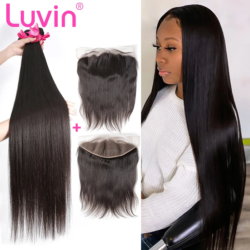 Luvin 28 30 32 34 40 дюймов прямые бразильские волосы плетение 3 4 пряди с 13x4 кружевной фронтальной и закрывающей Remy 100% человеческие волосы