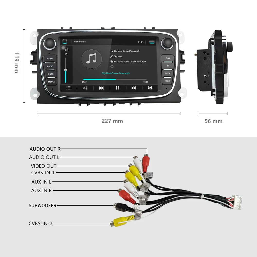 Пожалуйста, проверьте размеры заранееДля Focus II (2008-2011)Для S-Max (2008-2011)Для Mondeo 9 (2008-2011)Для Galaxy II (2006-2011)Для C-Max (2008-2011)Для Kuga (2006-2011)Особенности:1. Обновленная двойная система зеркальной связи: IOS/Android зеркальной связиIOS airplay:IOS поддерживает мобильный телефон с односторонней проекциейAndroid двусторонний: Android поддерживает мобильный телефон двустороннее соединение2. 7 дюймов HD Автомобильный Радио MP5 плеер с TFT постоянной ёмкости, универсальный конденсатор сенсорный экран3.CANBUS включает в себя: CANBUS может помочь в реализации синхронизации информации в реальном времени, что делает управление автомобилем более умным и точным4. Функция Dash Cam: видео-плеер автомобиля может подключаться к Dash cam era и имеет все функции dash cam, циклическая запись, автоматическое обнаружение аварий, упаковочный монитор5. Встроенный Bluetooth 4,0 с A2DP/Hands Free/Телефонная книгаПоддержка Bluetooth громкой связиМузыкальный плеер BluetoothАвтозагрузка телефонных книгАвтоматическая загрузка записей6. Встроенные электронные инструкции: ответьте на ваши вопросы в любое время7. Встроенный WIFI: подключение к WIFI, и вы найдете новый мир, самый удобный-это онлайн-карта.8. Обучение рулевому колесу: через него вы можете управлять функциями, которые вам нужны, с помощью рулевого колеса, более удобно9. Встроенный GPS приемник, совместимый с Waze/Navfree/Google Map и т. Д.: с тех пор, пока есть место назначения, вы можете пойти куда угодно и никогда не потеряться снова!10. Встроенный 16G флэш-память для музыки/навигационной карты данных/видео11. Высокое разрешение: 1024P Full HD дает вам фантастический опыт просмотра HD видео12. Функция ввода камеры заднего вида: необходимо выбрать камеру, автомобиль подключен к обратной передаче для автоматического переключения (требуется дополнительно)13. Отключение питания с функцией автоматического хранения памяти в режиме радио или TF/USB14. Поддержка настройки логотипа загрузочного экрана, виды логотипа автомобиля могут быть настроены на выбор самостоятельно15. Различные эквалайзерные звуковые эффекты выбор сцены16. Fm-радио: вы можете слушать трафик в реальном времени, новости boradcasts, прогноза погоды и т. Д., так что утомительное Вождение не является монотоннымОсобенностиРазмер изделия: 227*119*56 ммСистема: AndroidЧип усилителя: TDA7388ОЗУ: 1 ГбПЗУ: 16 ГбРазмер экрана: 7 ''емкостной сенсорный экранРазрешение экрана: 1024*600Радиочип: MT6625Радио: FM (нет AM/RDS)Радиочастота: 87,5 ~ 108 МГцМаксимальная выходная мощность: 4*45 Вт (макс.)Порты RCA: 2 * аудиовыход, 2 * AUX-in, 2 * Video-in, 1 * Video-out,1 * RCAM-in,Язык: китайский/английский/французский/немецкий/русский/испанский/Греческий/итальянский/Корейский/тайский/Датский/Чешский/Португальский/Турецкий/японский и т. Д.Товар входит в комплект1 x Android плеер1 х Кабель питания2 usb-адаптера1 х RCA кабели1 x Антенна GPS1 x CANBUS1 х CAM-VIN кабель1 x Руководство пользователя