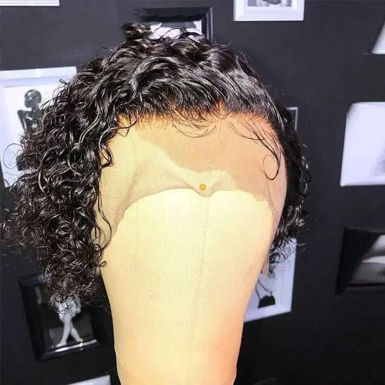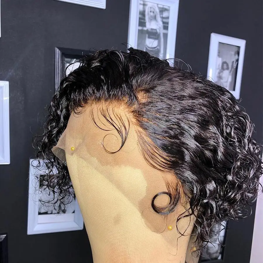 Вьющиеся стрижка Пикси парик Синтетические волосы на кружеве человеческих волос парики для чернокожих Для женщин натуральные Цвет предварительно вы короткий Боб воды 180% человеческих волос