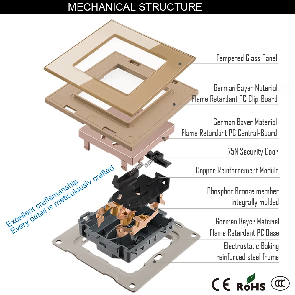 1. Качество гарантировано сертификатами CE, RoHS и China CCC2. 100% новая и высококачественная настенная розетка/панель переключателей.3. Стандарт воспламеняемости: V-04. Розетка европейского стандарта подходит для вилки Европейского или немецкого стандарта.5. Этот продукт должен быть установлен профессиональным электриком