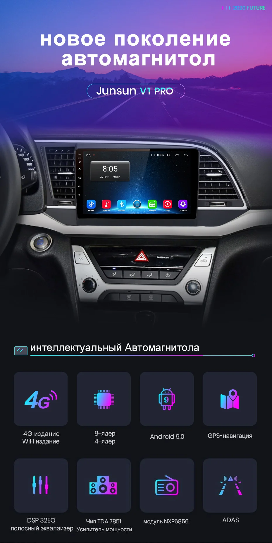 Junsun V1pro AI Голосовое CarPlay Автомагнитола Магнитола Мультимедиа автомобиля для Hyundai Elantra 2015 2016 2017 2018 Android auto 4G GPS трекер навигатор 2 DIN 2 дин андройд Аудио Автомагнитолы