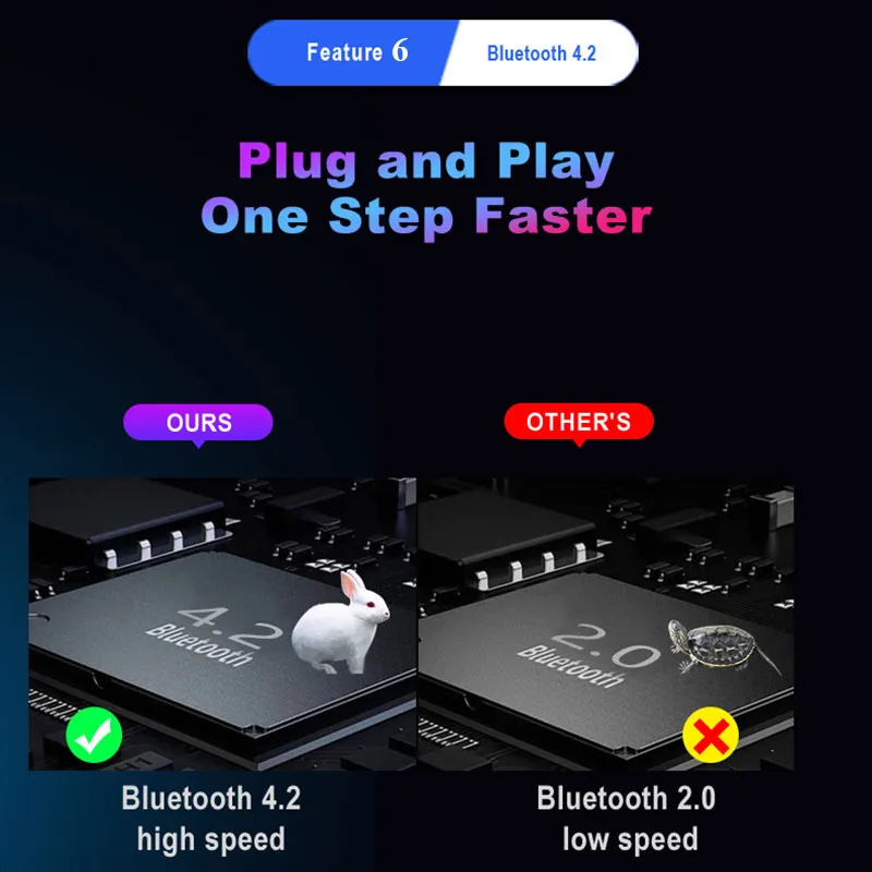1. Соединение Bluetooth 4,2 2. Подключение USB (без задержки) 3. Мощность: 4,8-5,2 V